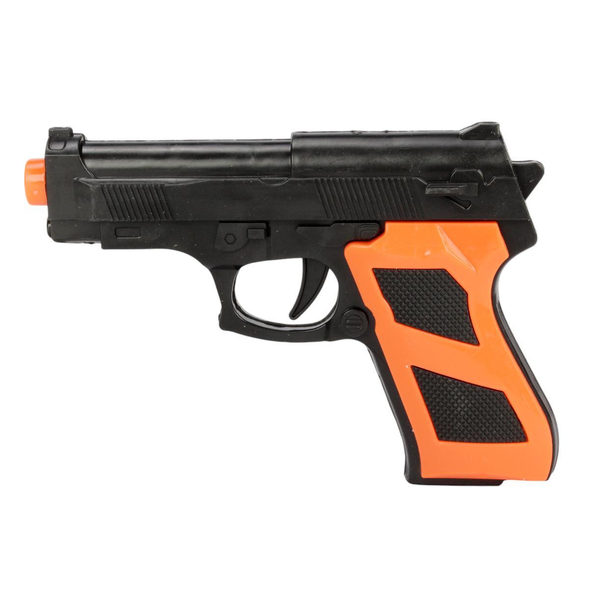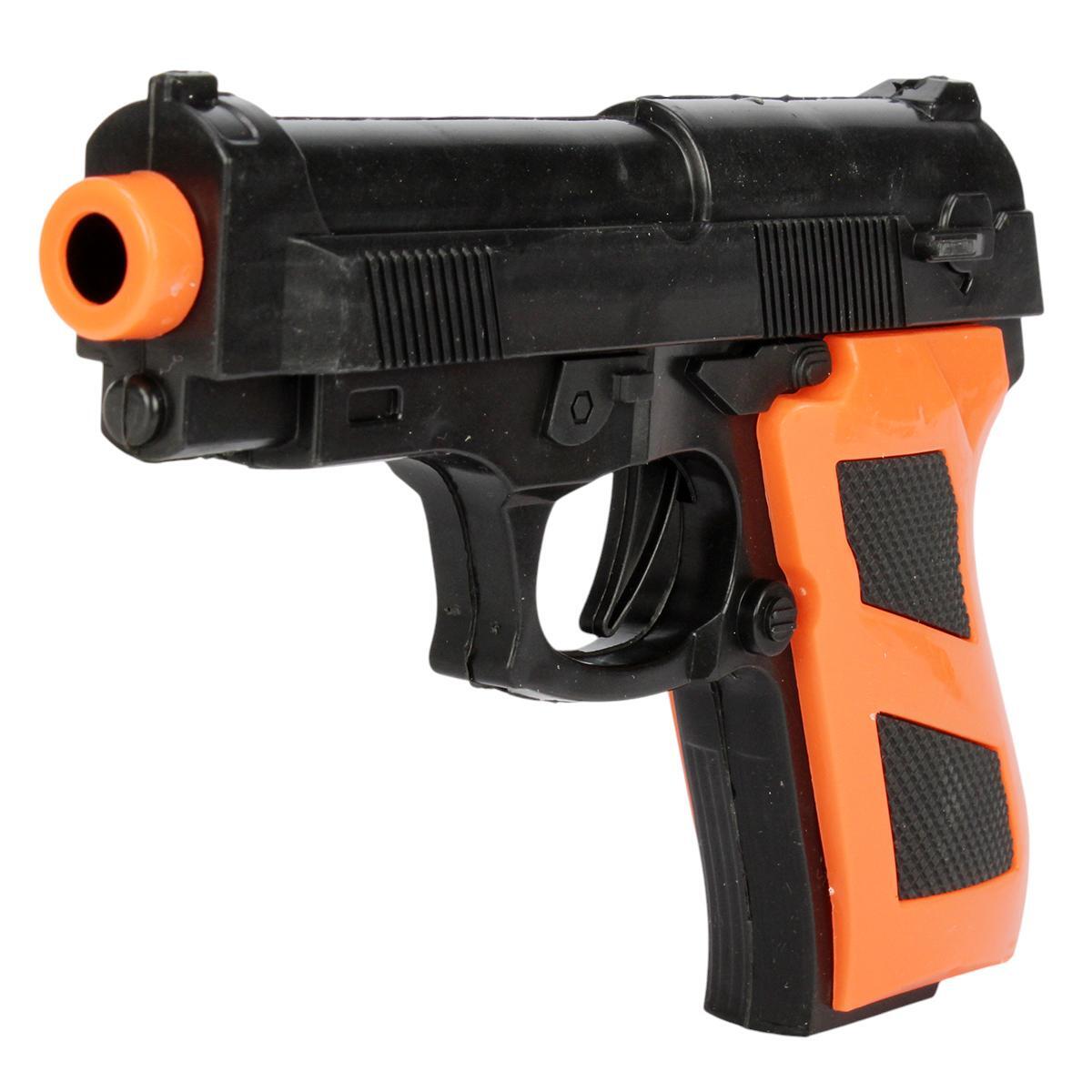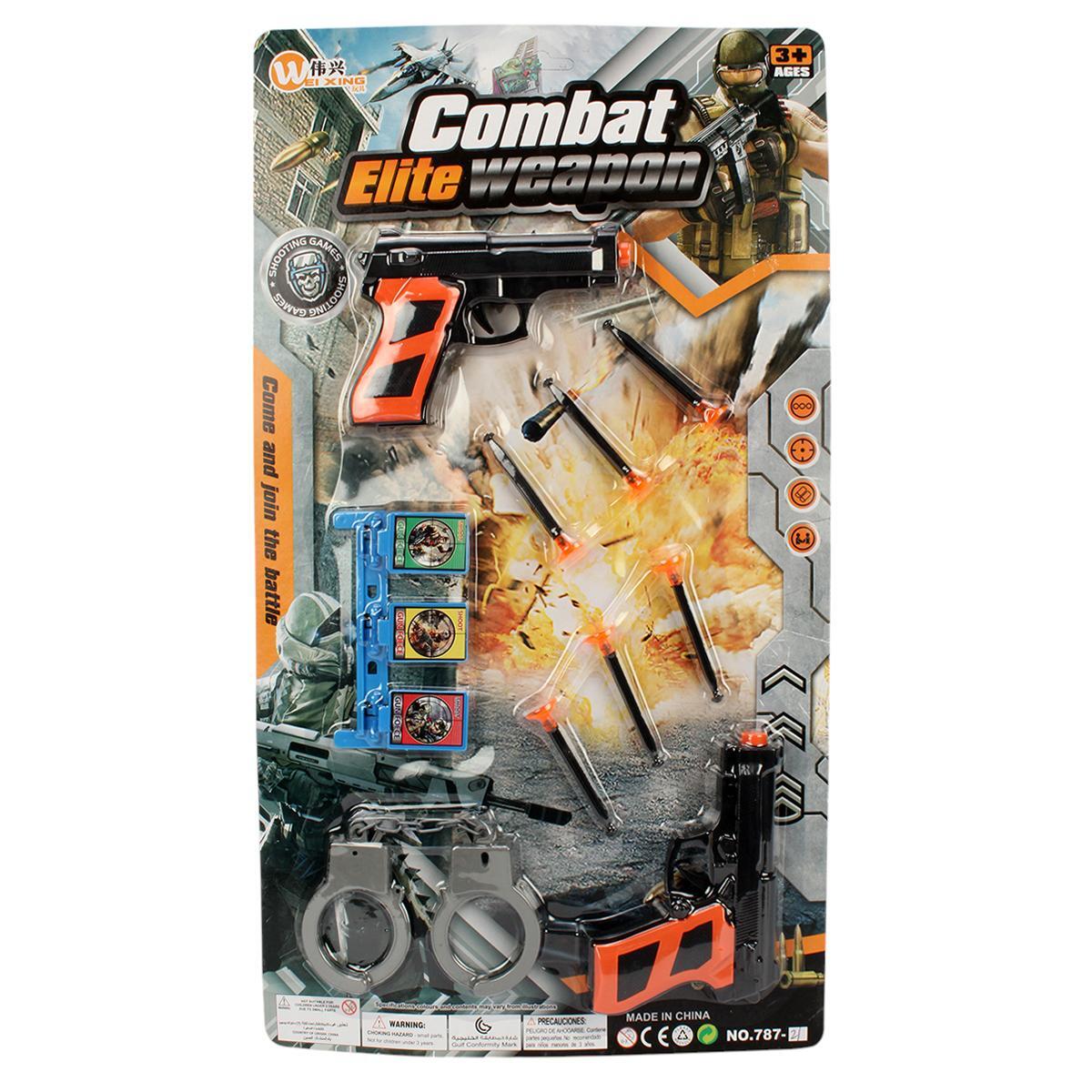 В комплект входит 2 пластиковых пистолета, 3 присоски для стрельбы, наручники и имитирующая мишень, выполненные из безопасного пластика. Пистолеты имеют реалистичный дизайн с яркими оранжевыми и черными элементами, что обеспечивает высокий уровень безопасности и удобство использования для малышей.