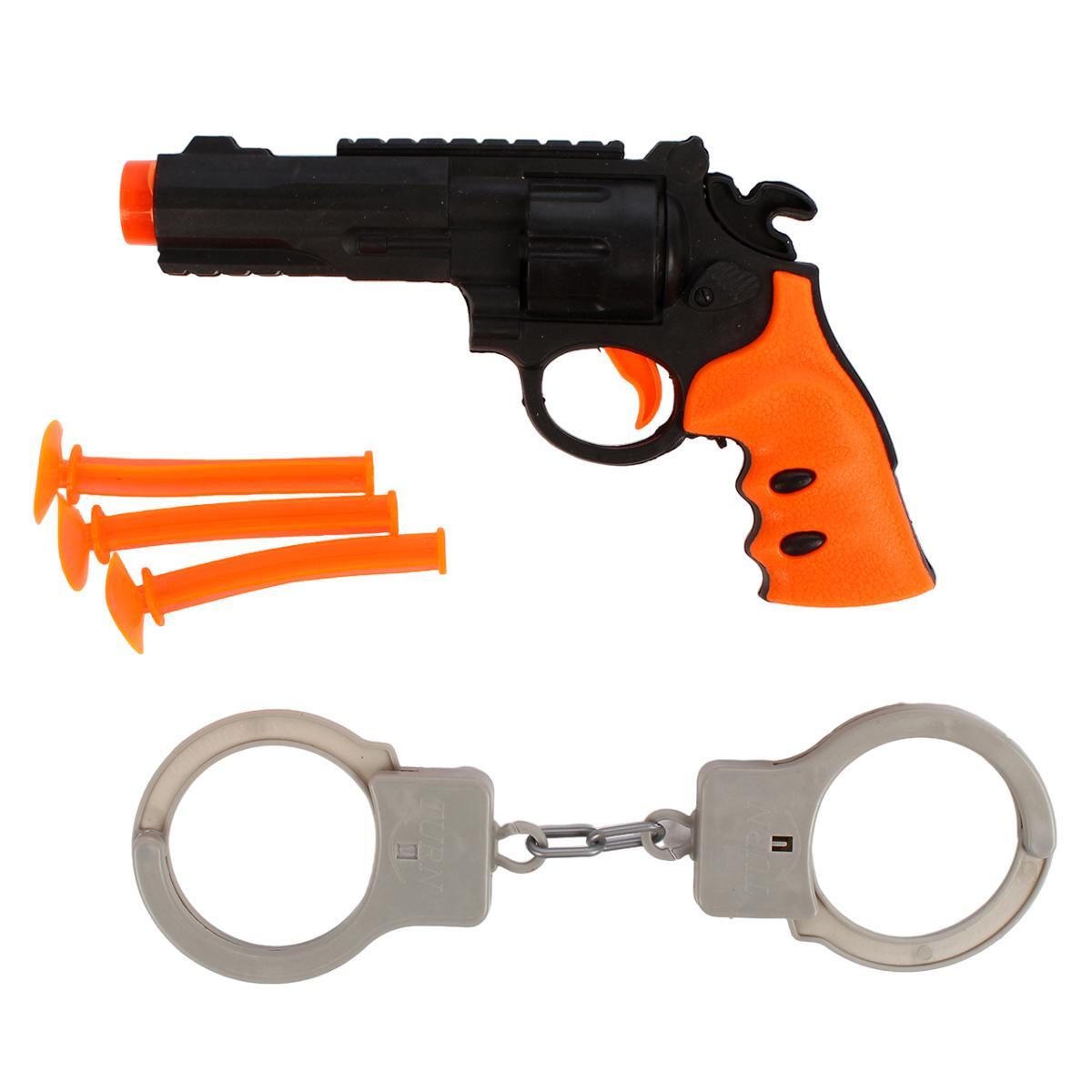 В набор входят: один игрушечный пистолет, три пластиковые пули и наручники. Игрушка предназначена для детей старше 3 лет, что делает ее идеальной для совместных игр с друзьями или братьями и сестрами. Пистолет выполнен в черном и оранжевом цветах, что придает ему реалистичный вид, а наручники добавляют элемент интерактивности в игру.