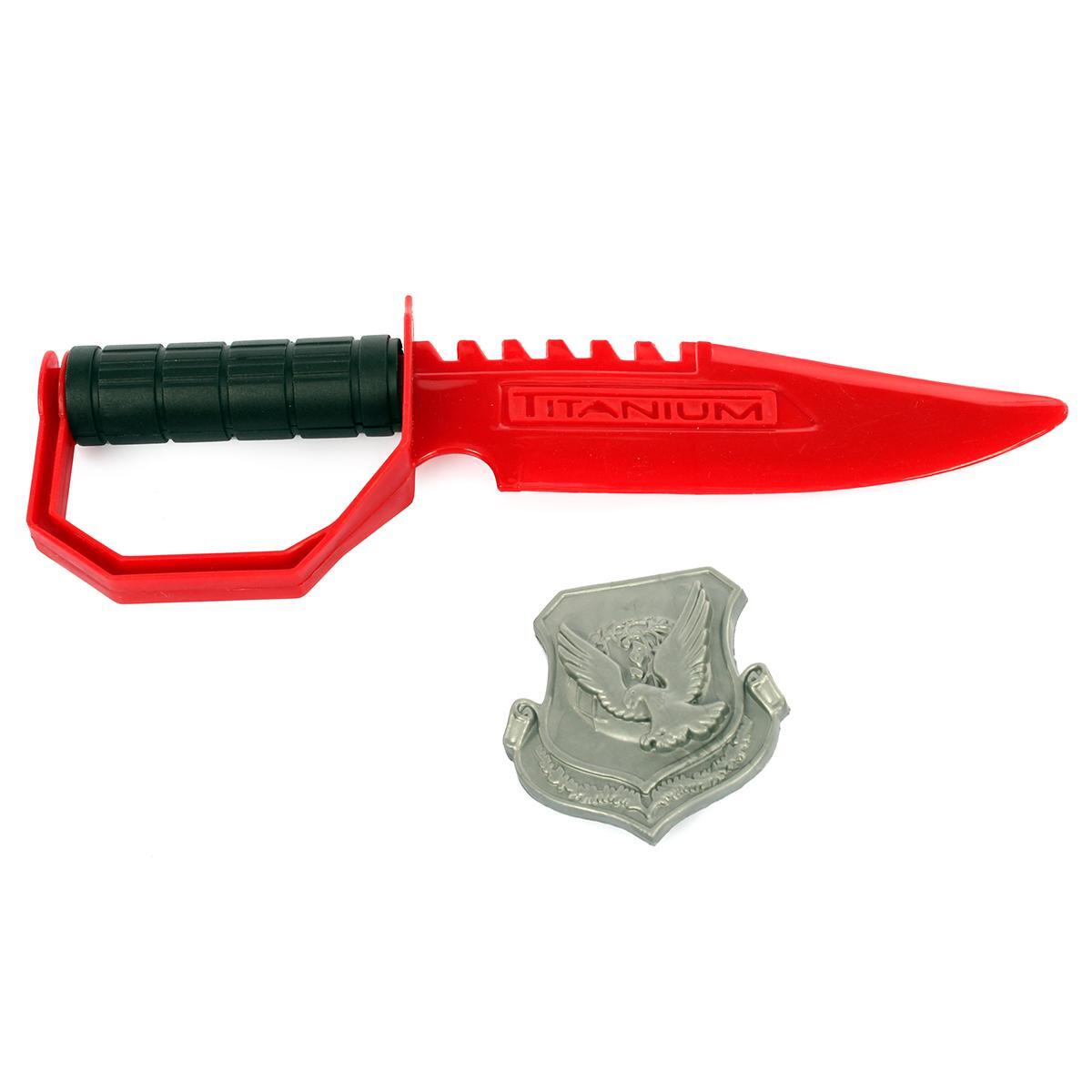 Пластиковый набор включает автомат с имитацией металлических деталей, нож и значок с гербом, что делает игру более захватывающей. Надежность и практичность позволяют использовать его как для домашних игр, так и для активного времяпрепровождения на улице. Такой комплект отлично стимулирует фантазию и развивает навыки ролевых игр у детей.