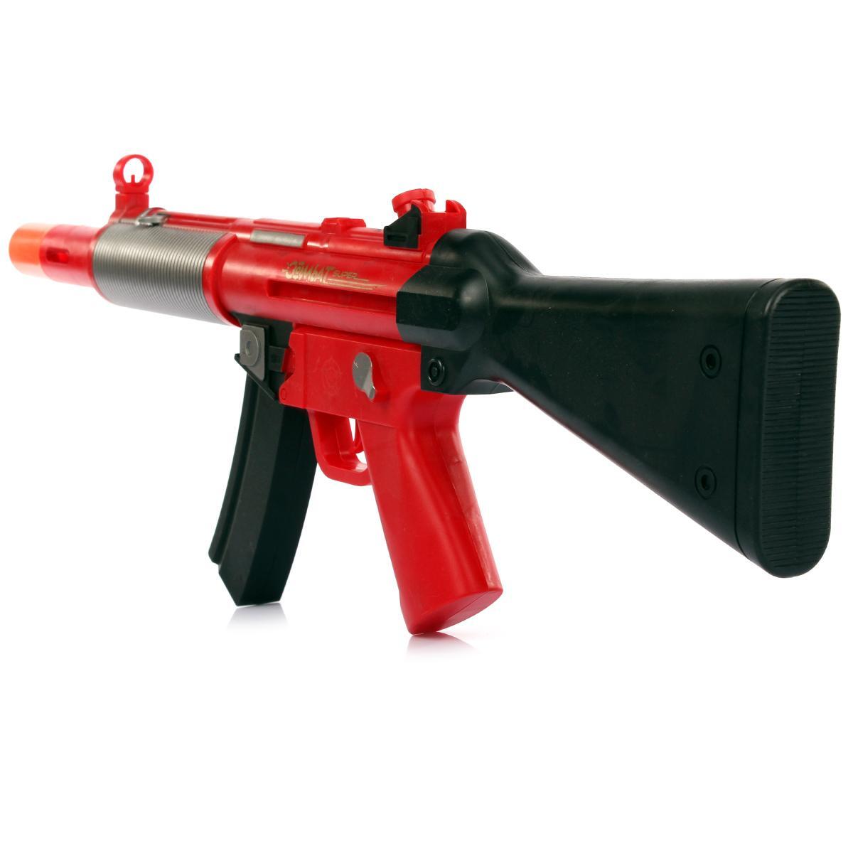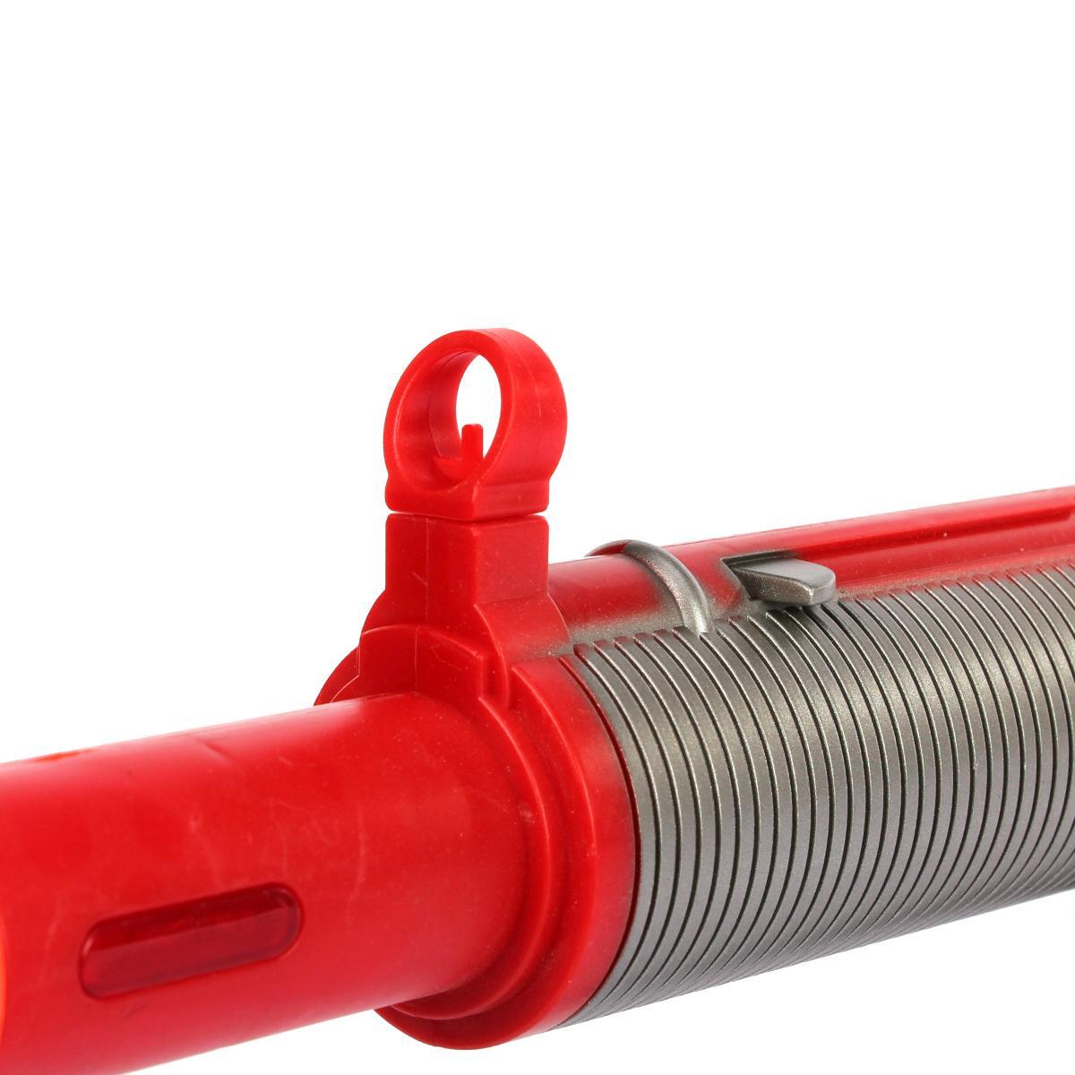 Основная винтовка длиной 60 см выполнена из ударопрочного пластика с металлическими вставками в области ствола. Яркие контрастные цвета (красный/черный) с серебристыми акцентами создают эффектный внешний вид. Оранжевая насадка на стволе соответствует международным стандартам безопасности игрушек.