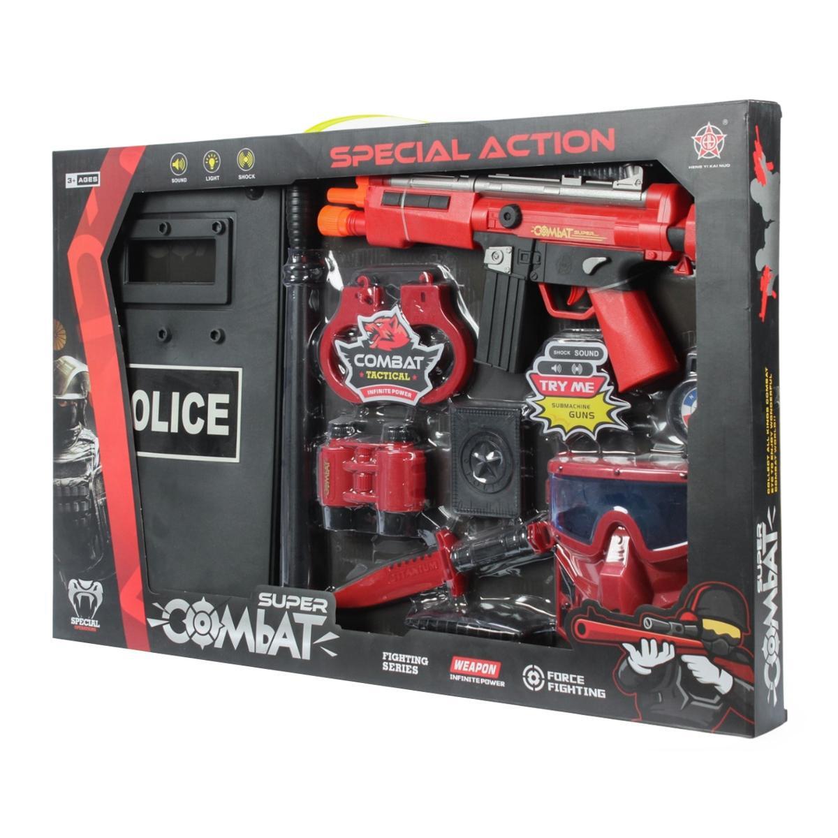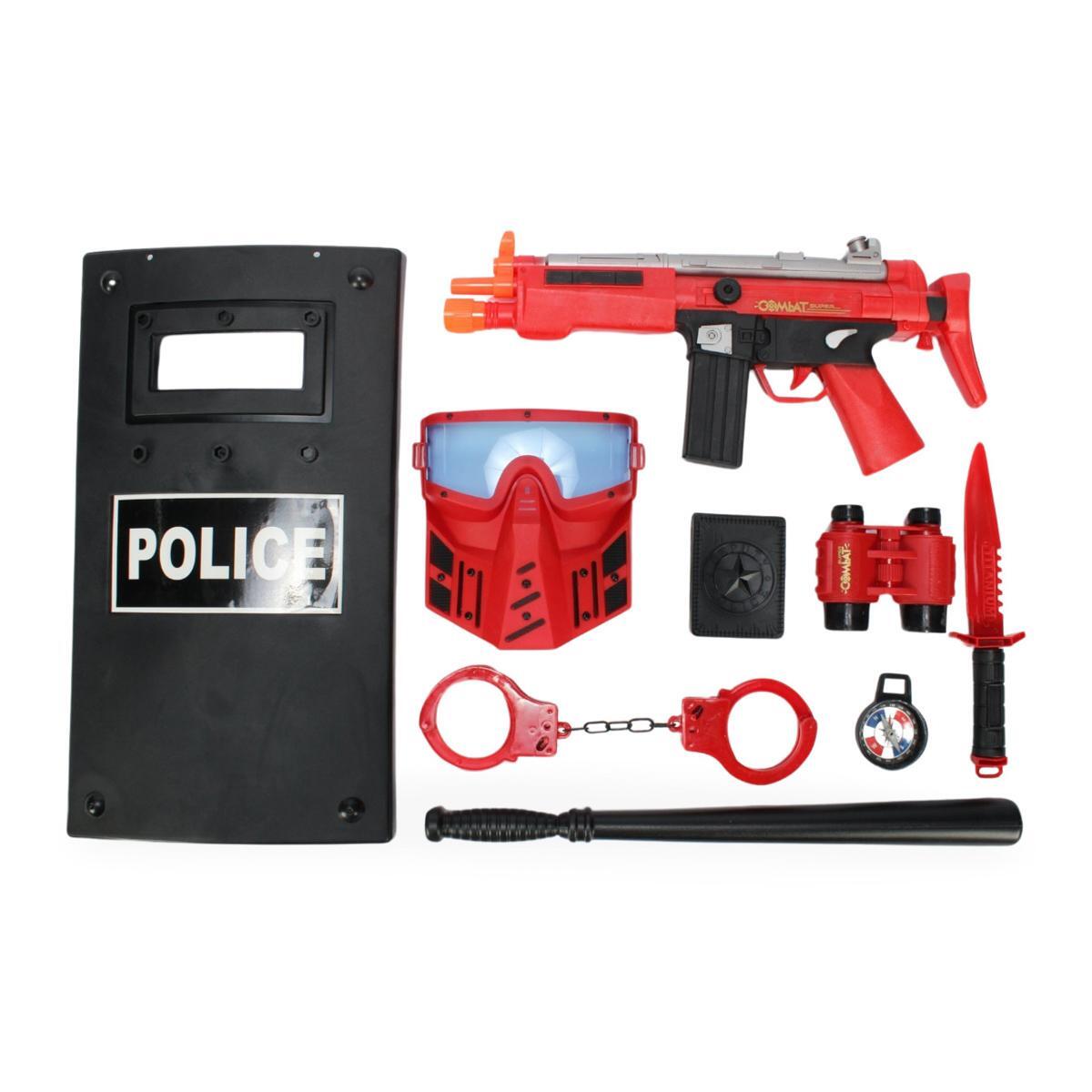Набор включает в себя 8 предметов: полицейский штурмовой щит, автомат, наручники, бинокль, удостоверение, боевой нож, дубинку и защитную маску. Все элементы идеально подходят для ролевых игр, развивая воображение и креативность вашего ребенка. Набор подходит для детей старше 3 лет и станет отличным подарком на день рождения или праздник.