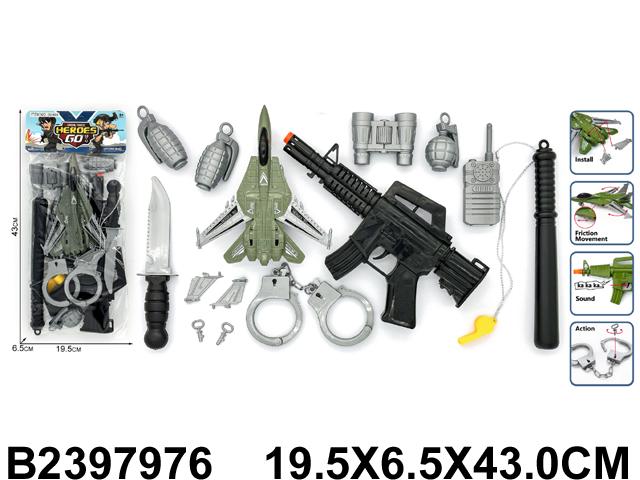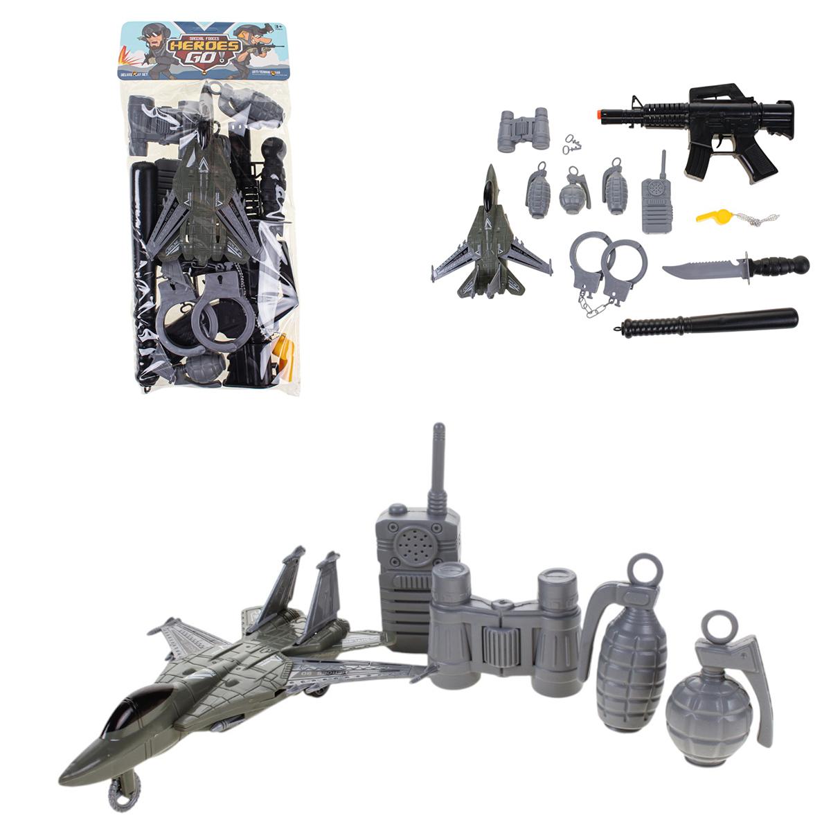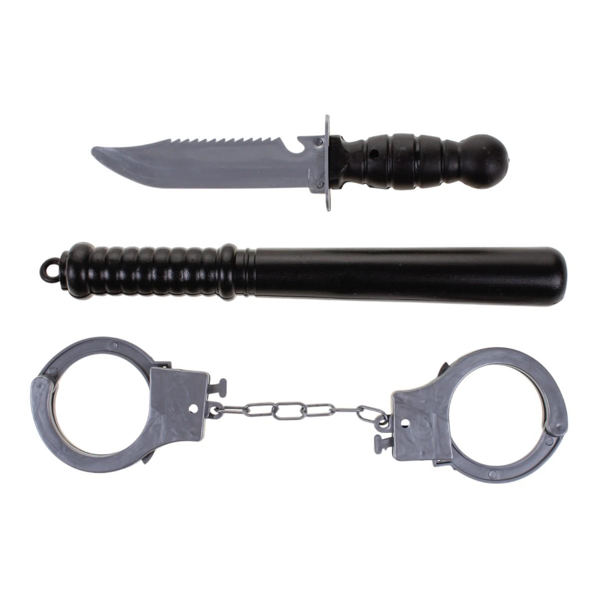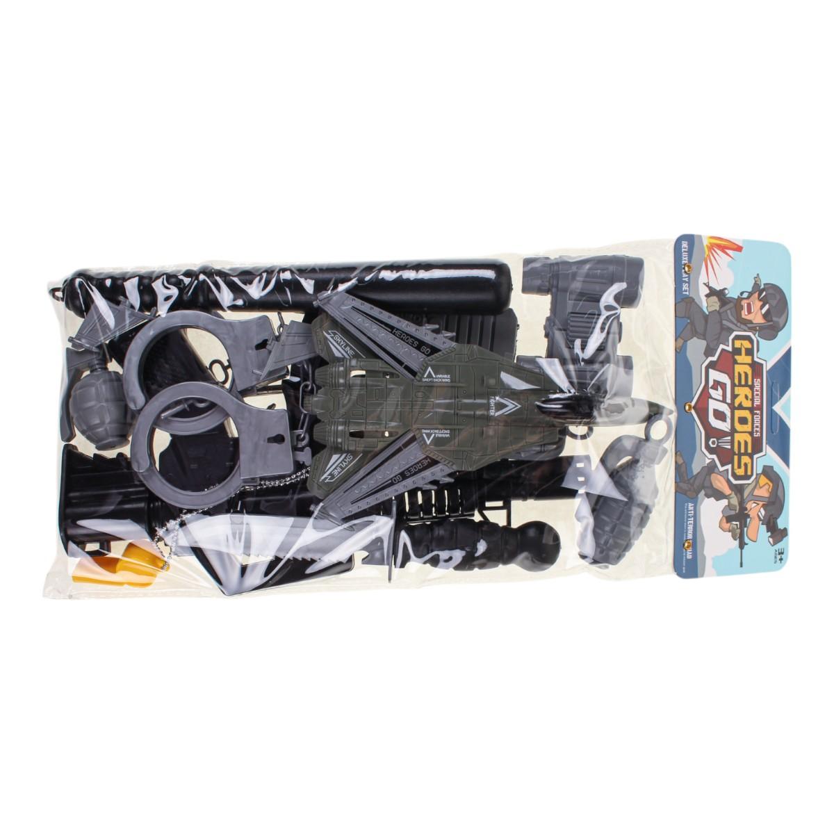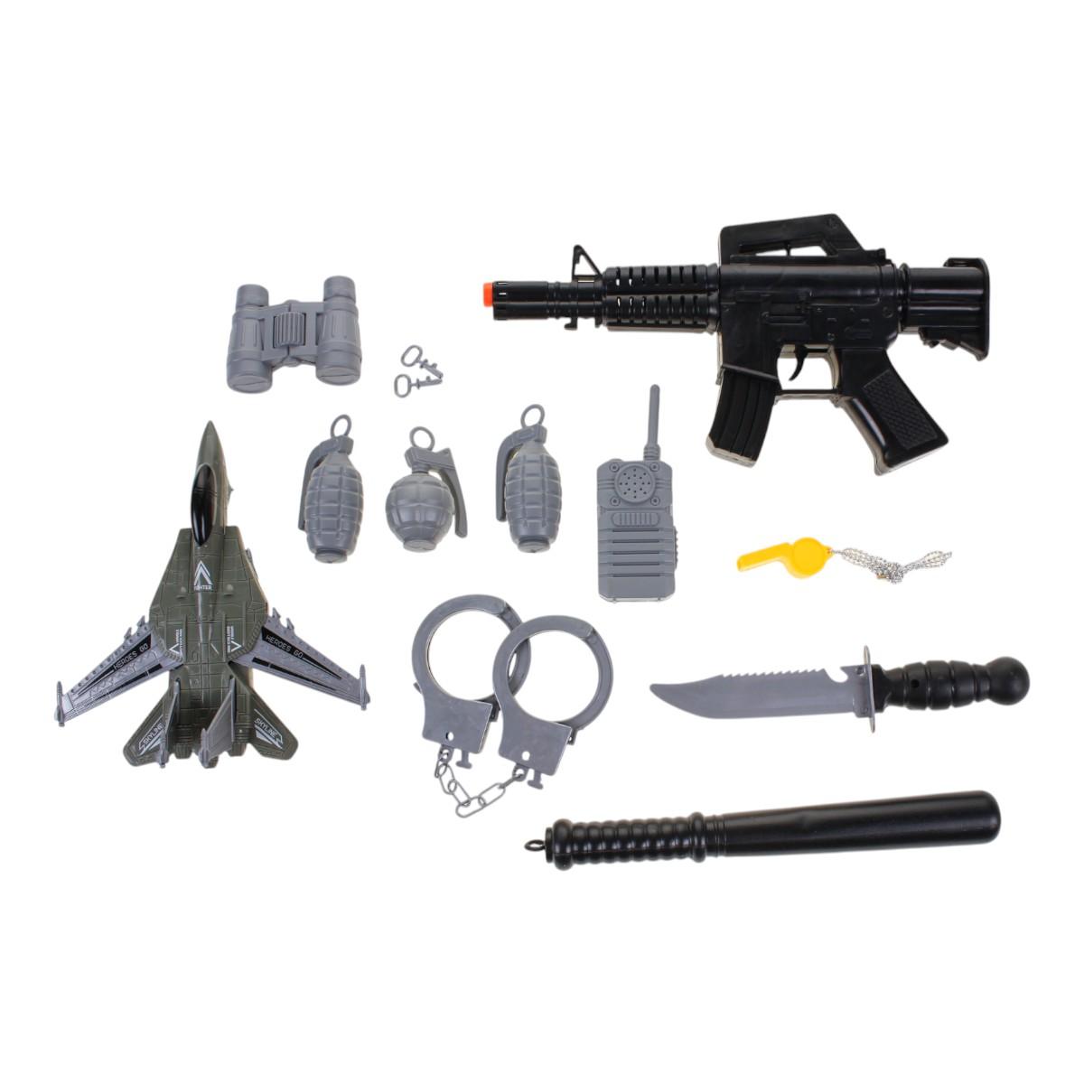 Размер упаковки 19.5×6.5×43 см позволяет удобно хранить набор. Сочетание черного, серого и зеленого цветов создает узнаваемый военный стиль. Предметы идеально подходят для сюжетно-ролевых игр в помещении и на улице.