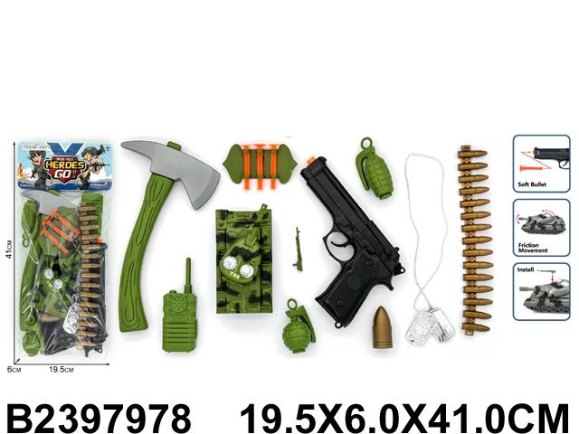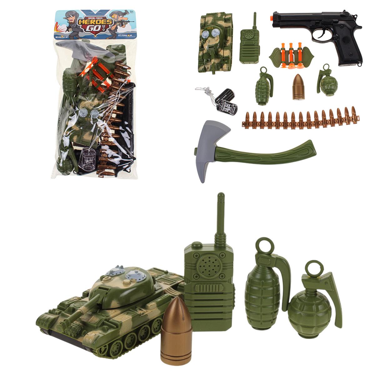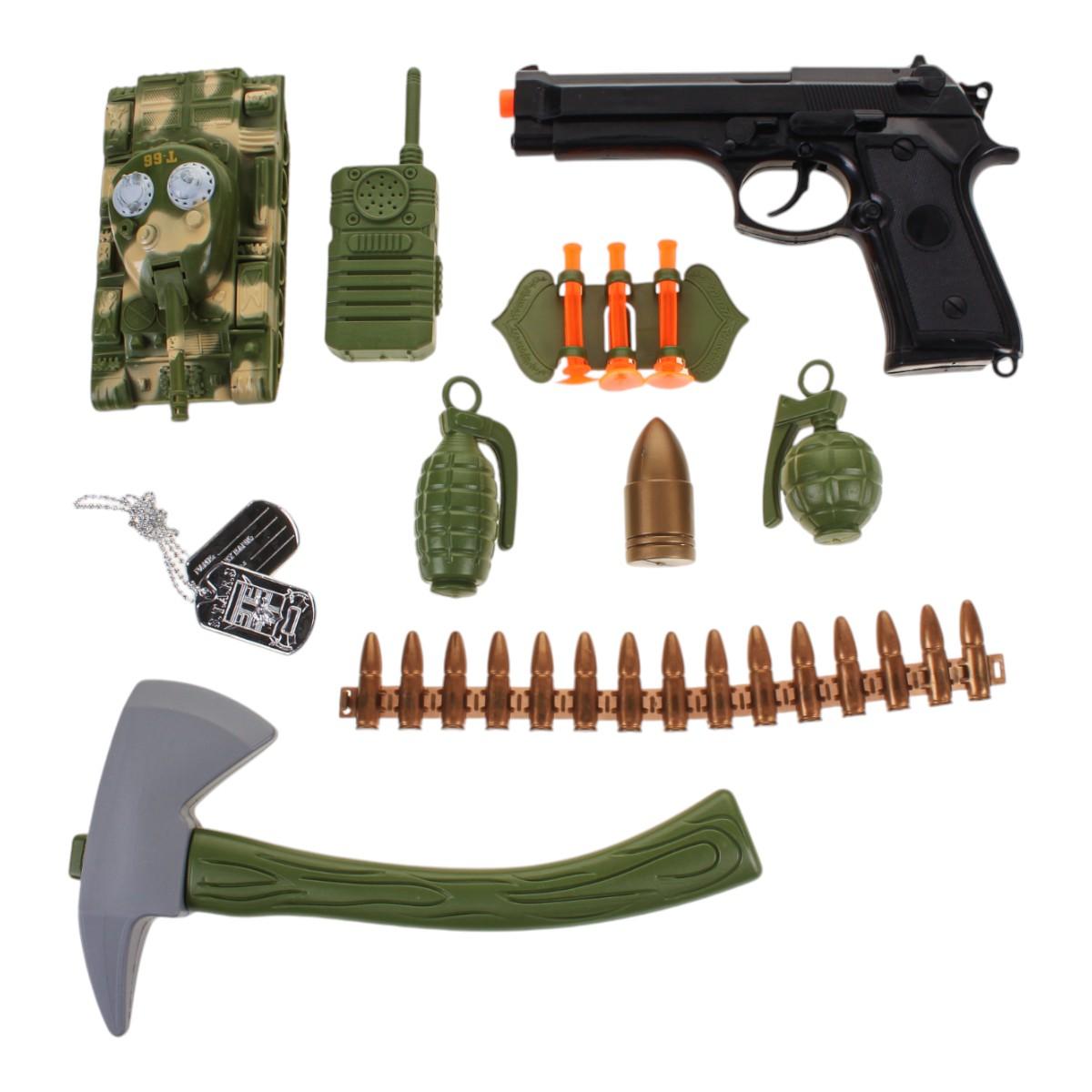 Этот игровой набор создан для детей, любящих военные игры и приключения. В комплект входит 9 элементов: пистолет, гранаты, топор, танк, рация, патронташ, присоски и жетон — все из прочного безопасного пластика.