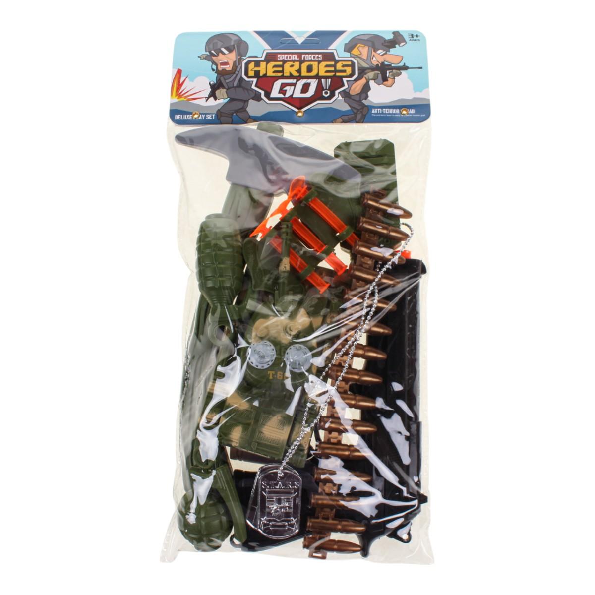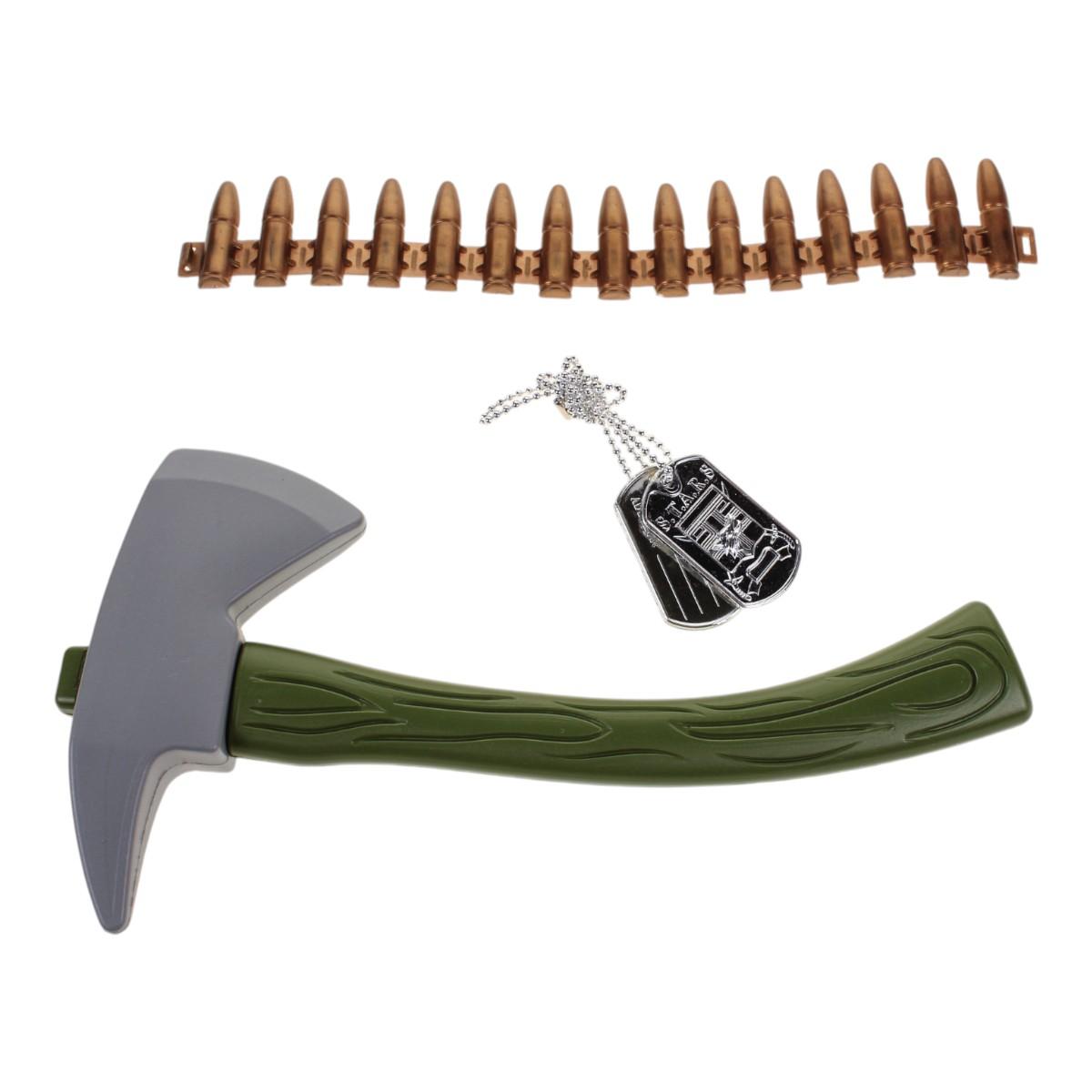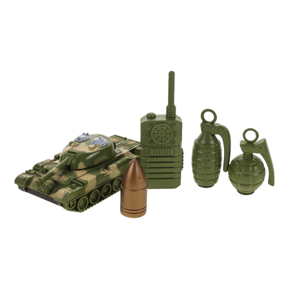 Этот игровой набор создан для детей, любящих военные игры и приключения. В комплект входит 9 элементов: пистолет, гранаты, топор, танк, рация, патронташ, присоски и жетон — все из прочного безопасного пластика.