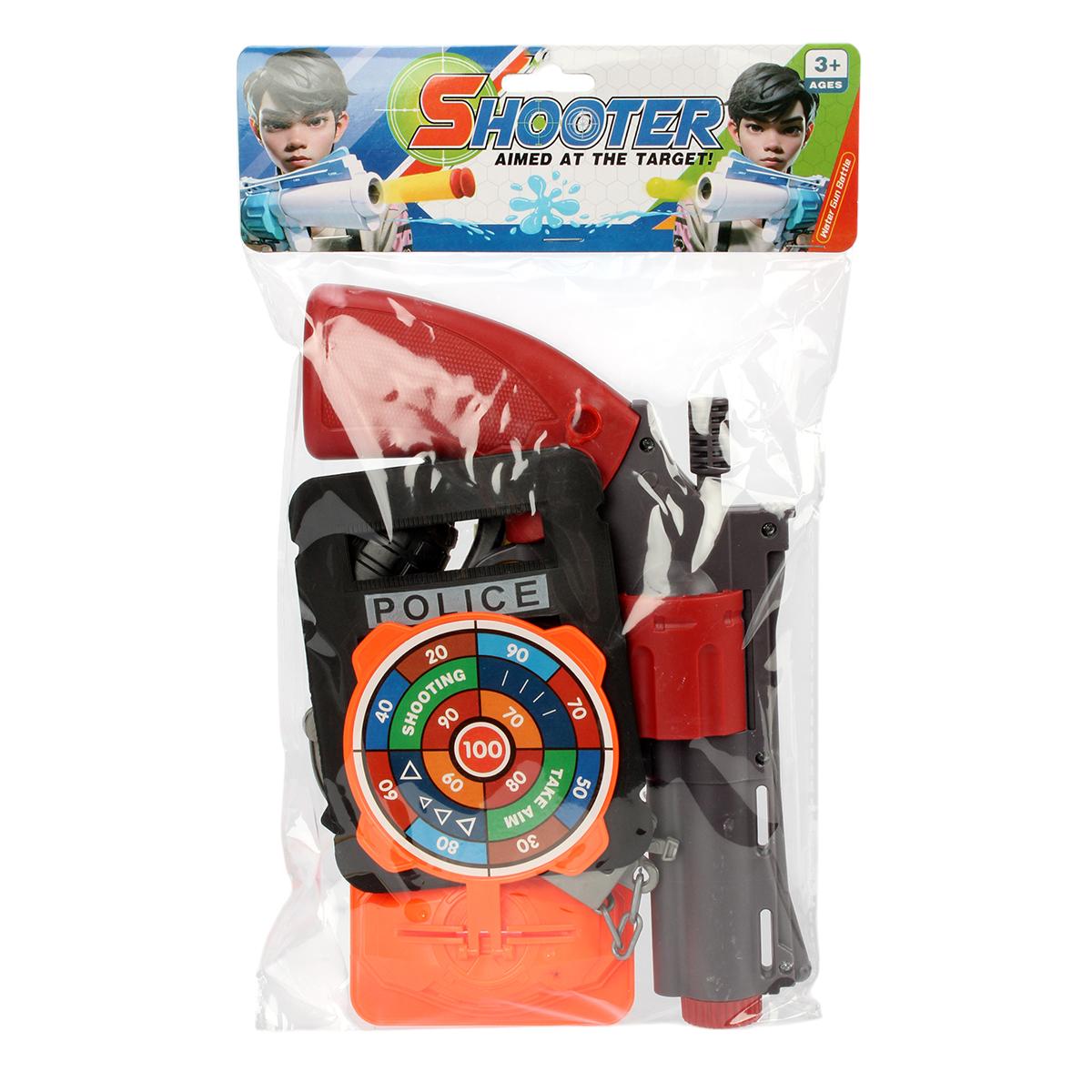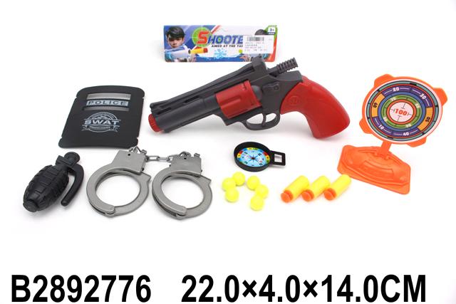 Размер упаковки составляет 22,0 * 4,0 * 14,0 см, что делает набор компактным и удобным для хранения. Все элементы набора, включая пистолет, наручники, гранату и мишень, выполнены из прочного пластика, что гарантирует их безопасность и долговечность. Мишень имеет многоцветный дизайн с числовыми значениями, что добавляет элемент соревнования в игру.