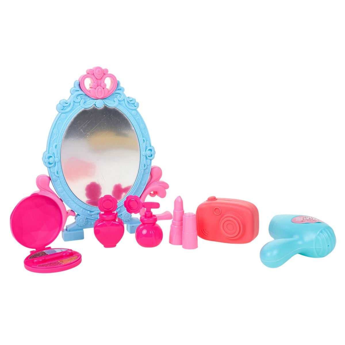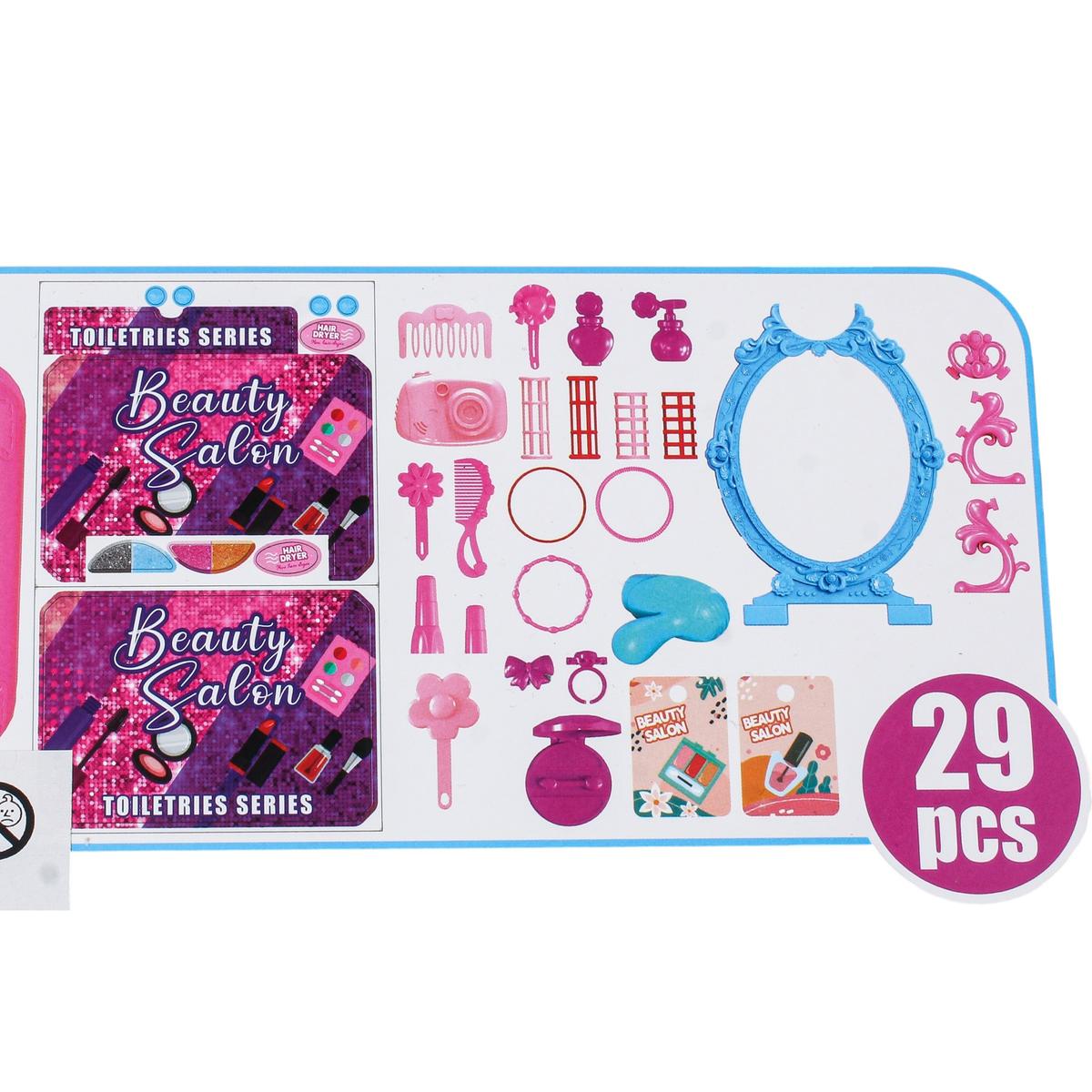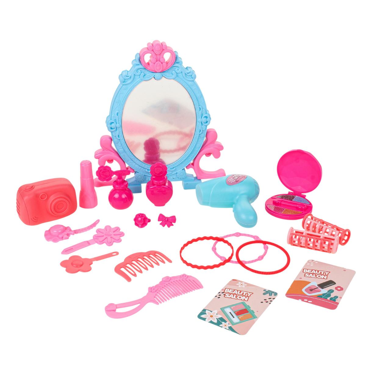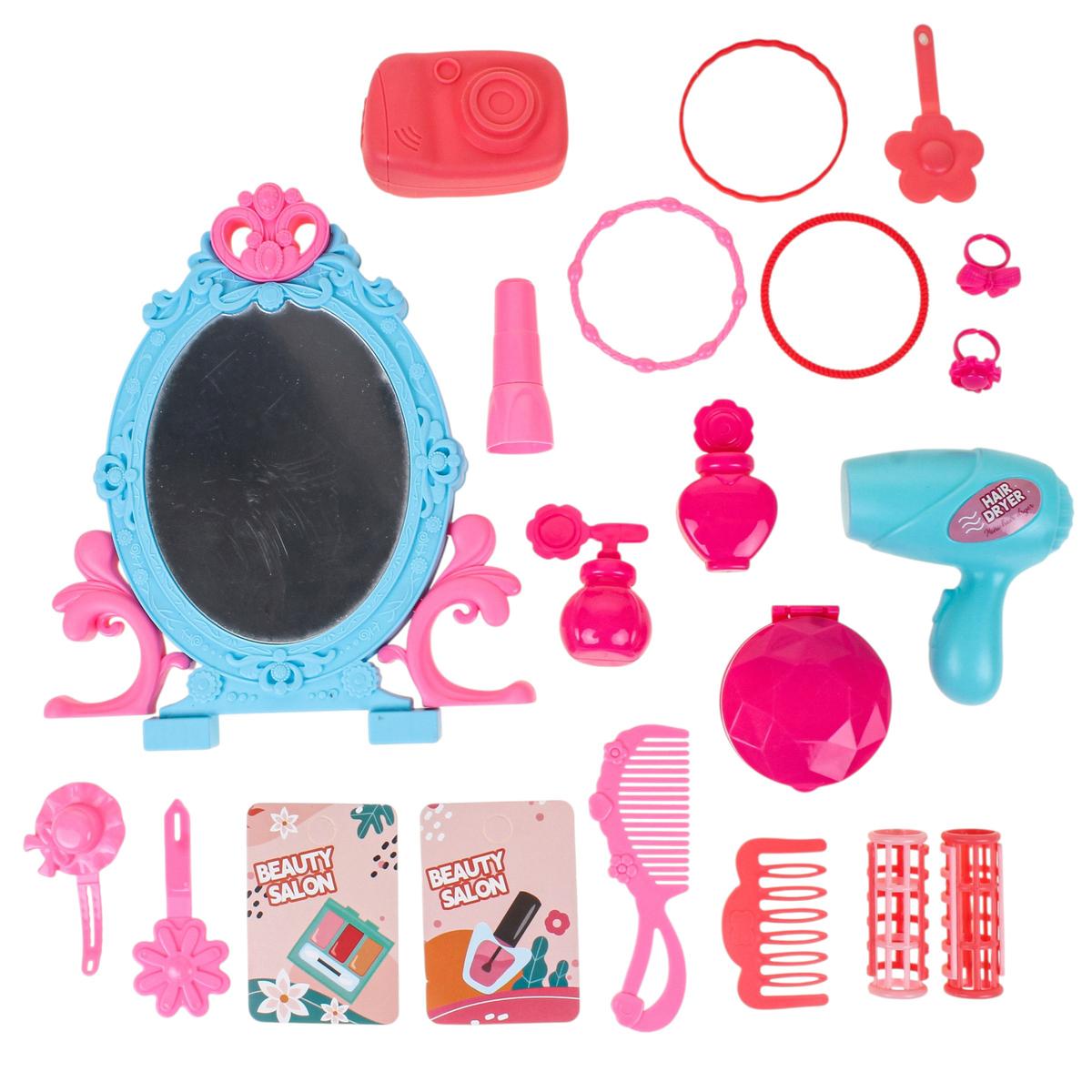Высота разложенного столика около 29 см, что удобно для игры дома. Набор помогает развивать воображение, мелкую моторику и коммуникативные навыки во время сюжетно-ролевых игр. Отличный вариант подарка для девочки, которая любит примерять новые образы и играть в салон красоты.