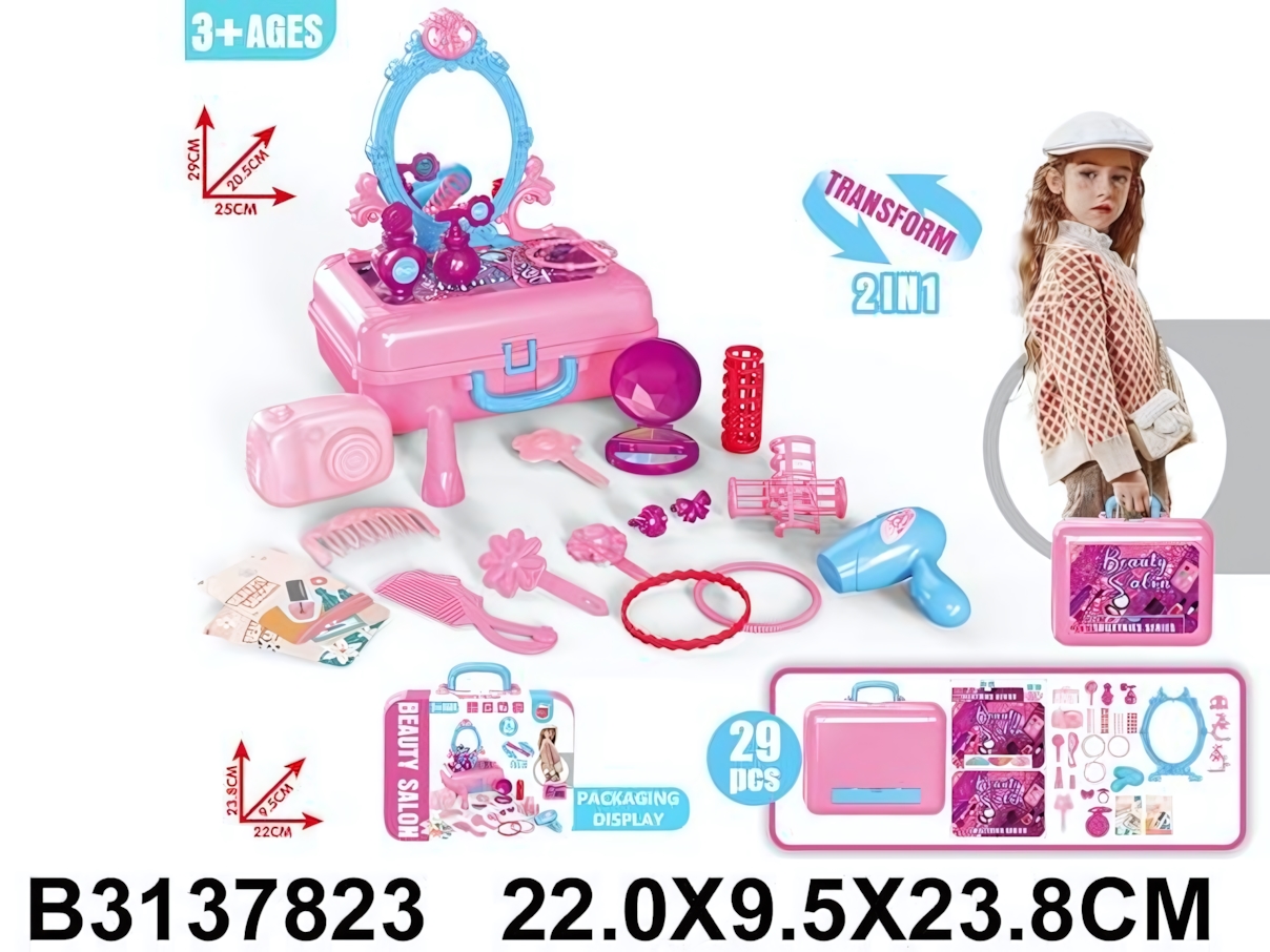 Подарите ребенку возможность почувствовать себя настоящим стилистом и открыть собственный салон красоты прямо дома. Набор парикмахера в удобном чемоданчике превращается в компактный туалетный столик с зеркалом, создавая атмосферу увлекательной и реалистичной игры.