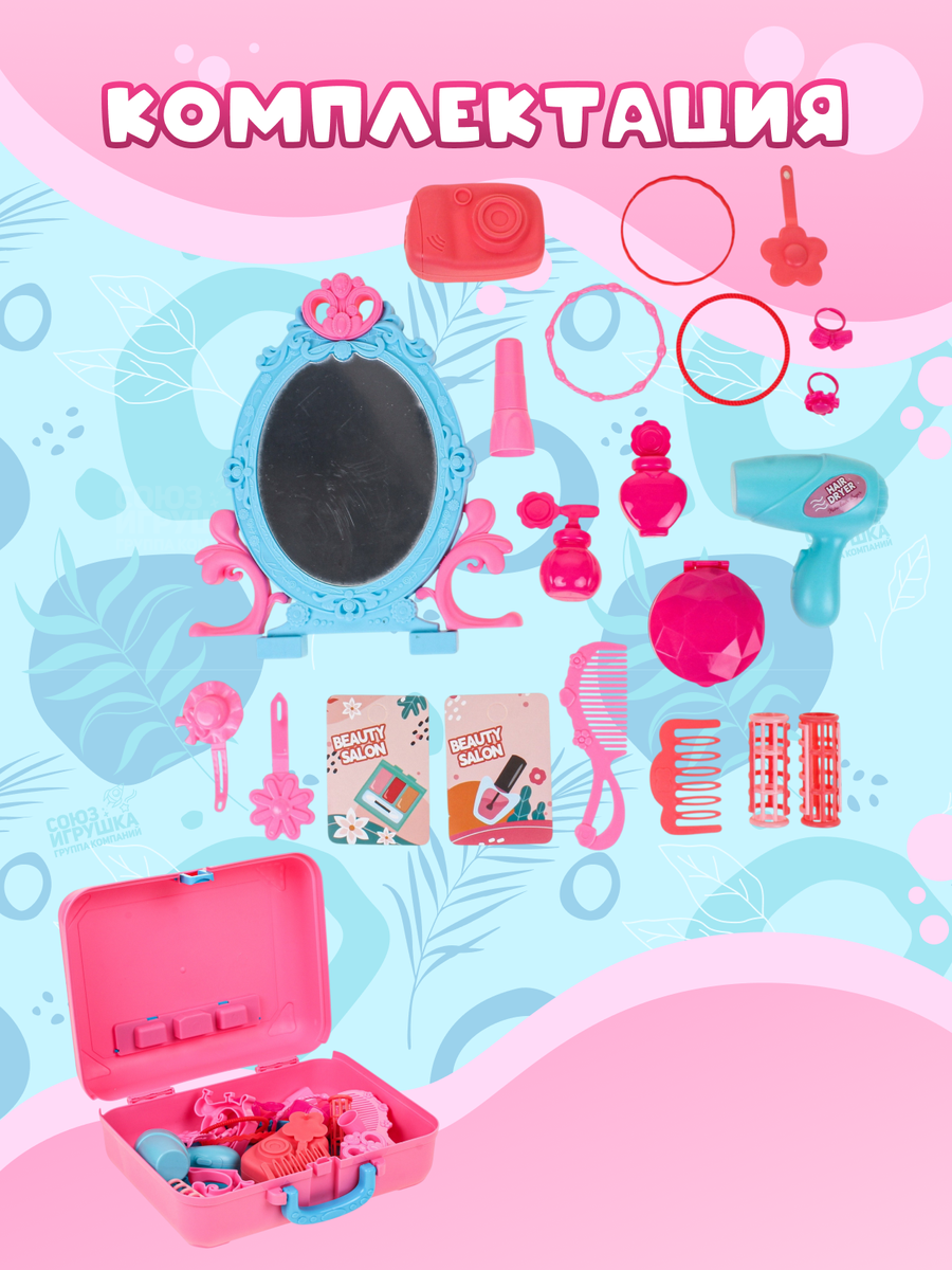 Легким движением чемодан раскрывается и превращается в игровое трюмо с овальным зеркалом. Такой формат 2 в 1 экономит место в детской комнате и позволяет брать любимый салон красоты с собой в гости или в поездку.