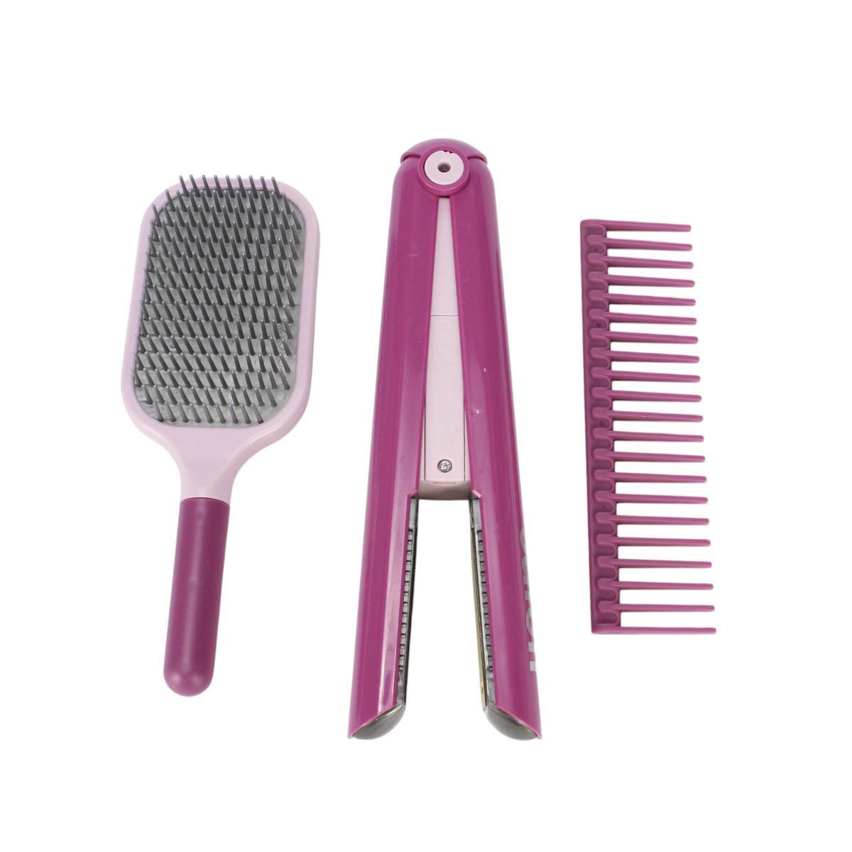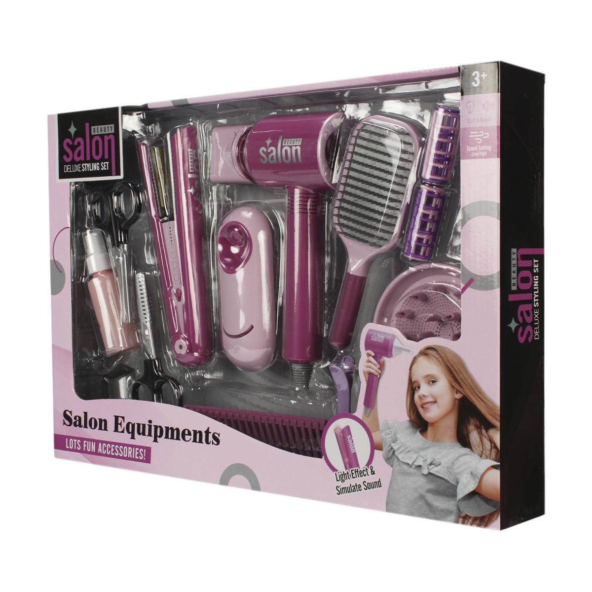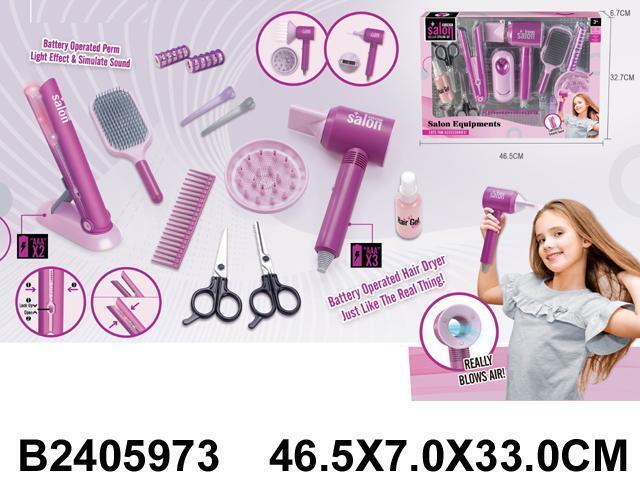 Все элементы выполнены из прочного пластика, безопасного для детей. Фен и плойка работают от батареек типа 'ААА' (не входят в комплект), что делает игру еще более увлекательной. Удобная коробка размером 46.5х7х33 см позволяет легко хранить и переносить все принадлежности.