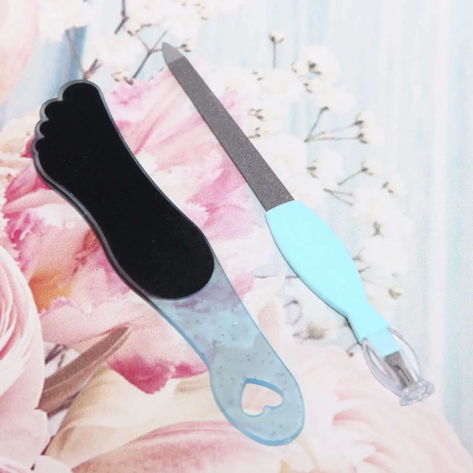 В набор входят пилочка для ногтей и педикюрная доска, которые идеально подходят для ухода за ногами. Пилка с черной абразивной поверхностью и розовой ручкой обеспечивает качественную обработку ногтей, а педикюрная доска с формой стопы и прозрачной рамкой позволяет легко ухаживать за кожей стоп. Эти инструменты подходят как для профессионального, так и для домашнего использования, что делает их универсальными помощниками в уходе за собой.