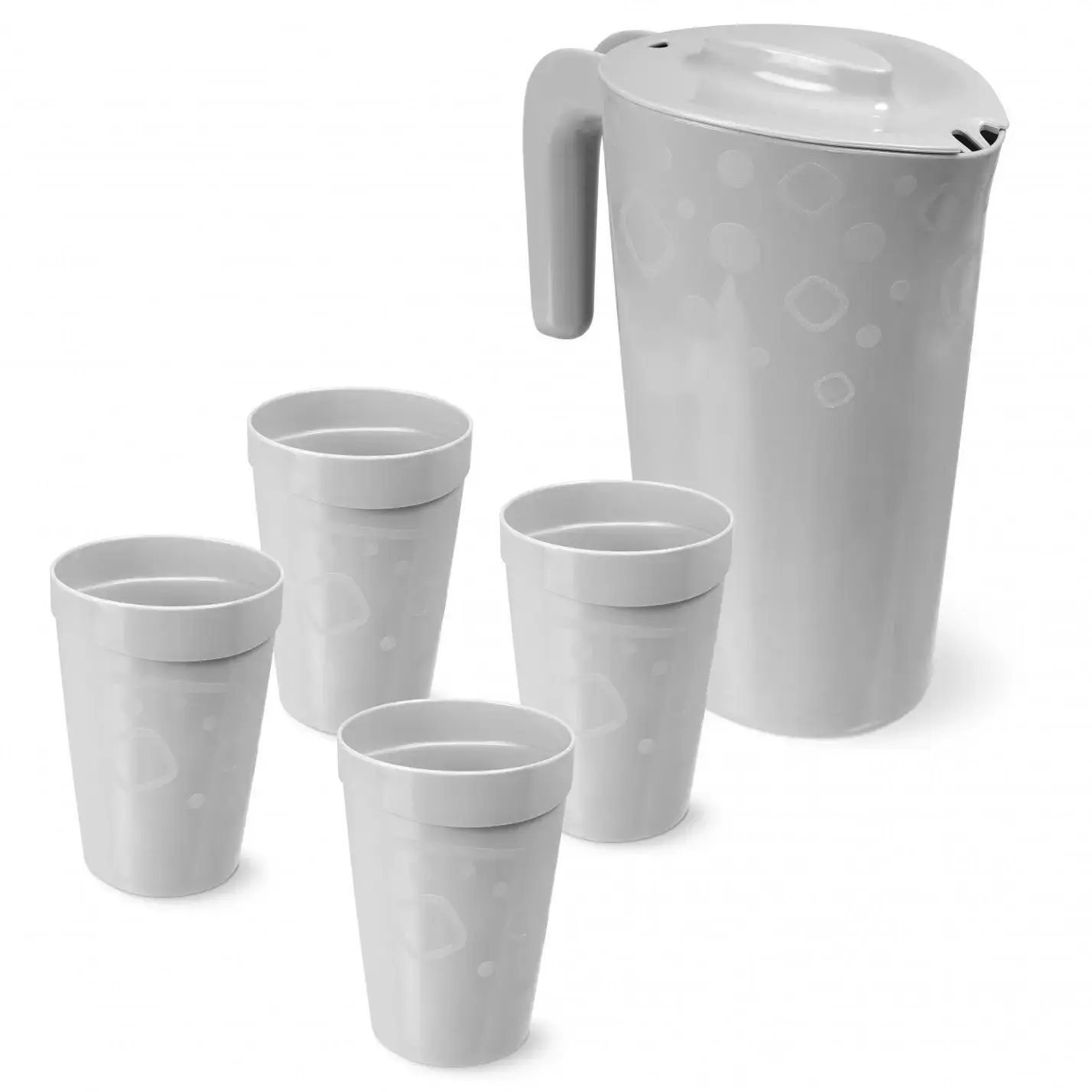 Легкий пластик делает комплект мобильным: переносите напитки из кухни в гостиную без риска разбить. Гладкая поверхность не впитывает запахи и легко моется в посудомоечной машине. Геометрический узор добавляет изюминку в повседневную сервировку.
