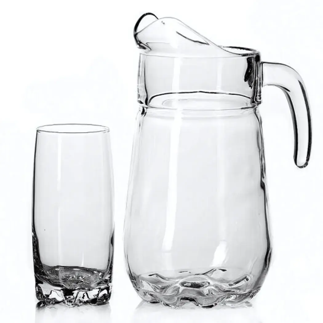 Набор из прочного стекла сочетает функциональность и лаконичный дизайн — идеальное решение для семейных ужинов и приёма гостей. Вместительный кувшин с удобным носиком и 6 стаканами цилиндрической формы создадут завершённую композицию на вашем столе.