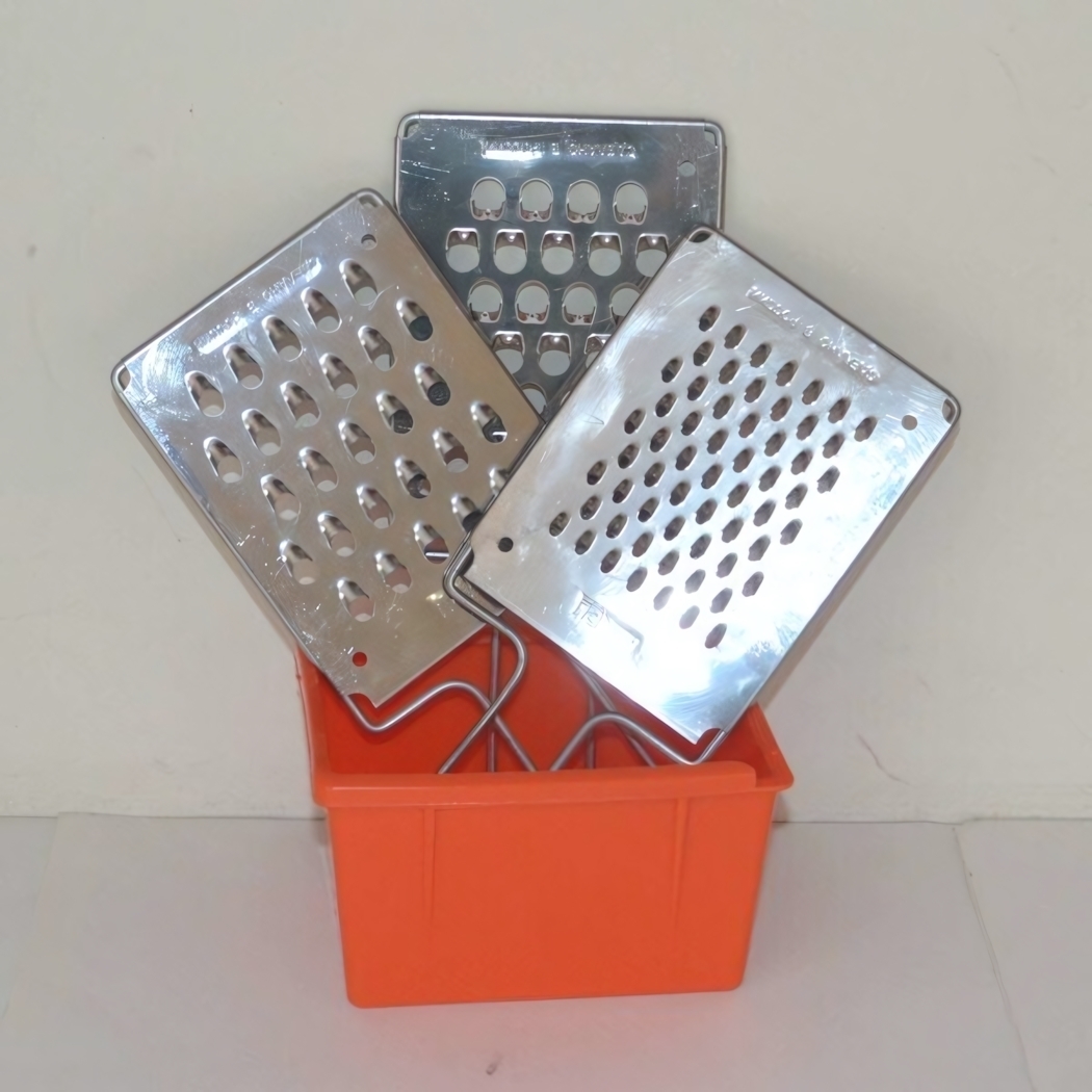 Набор включает три терки, каждая из которых имеет уникальную форму отверстий, что позволяет вам выбирать нужный вариант для конкретного продукта. Оранжевый пластиковый контейнер не только удобно хранит терки, но и позволяет поддерживать порядок на кухне. Этот набор идеально подходит как для профессиональных поваров, так и для домашних кулинаров, которые ценят качество и удобство.