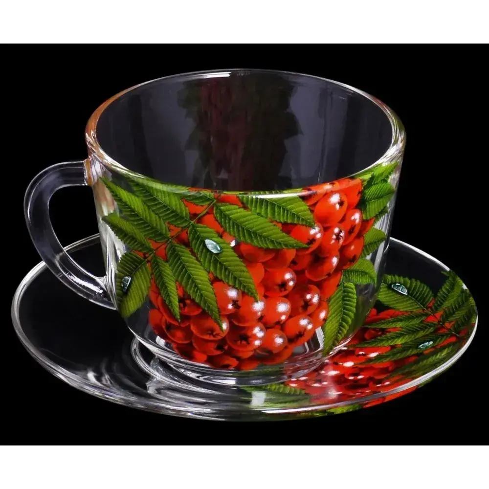 Подарочный набор 2 кружки и 2 блюдца из стекла с рисунком рябины, 300 мл