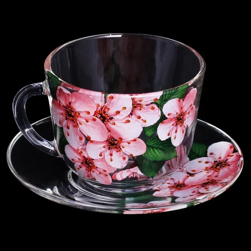 Набор из двух прозрачных кружек и блюдец с цветочным узором станет изысканным подарком к любому празднику. Рисунок сакуры в розово-зелёных тонах создаёт атмосферу японской гармонии, а прочное закалённое стекло гарантирует долгий срок службы.
