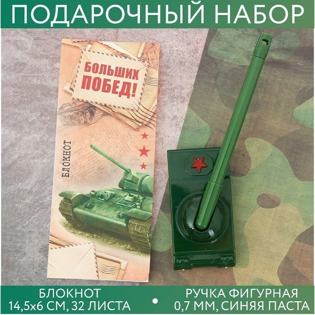 Светлый блокнот с эффектным принтом танка и мотивационной надписью «БОЛЬШИХ ПОБЕД!» гармонично сочетается со стилусом в камуфляжной расцветке. Красная звезда на корпусе стилуса добавляет аутентичности военному образу.