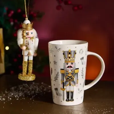 Этот элегантный подарочный набор объединяет утреннее тепло любимого напитка и атмосферу сказочного праздника. В него входит кружка объемом 385 мл из высококачественного фарфора и изящная ёлочная игрушка в виде фигурки Щелкунчика, украшенной золотыми деталями. Такой комплект станет ярким акцентом в доме и запомнится надолго.