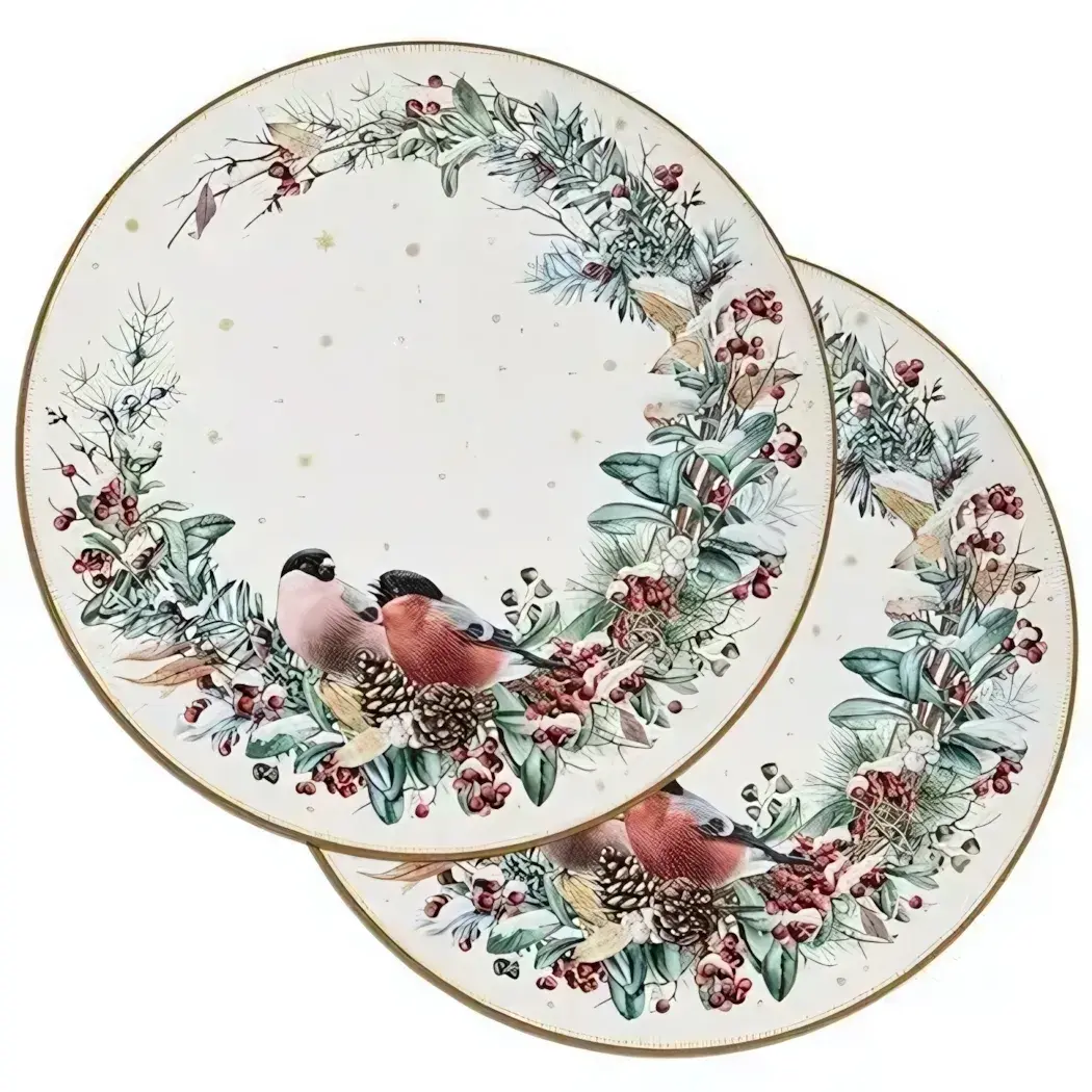 Создайте атмосферу уюта и праздничного настроения на вашем столе с подстановочной салфеткой «Снегири». Яркий зимний орнамент с ветками хвои, красными ягодами и изящной окантовкой гармонично впишется в сервировку, добавив тепла и шарма вашей трапезе.