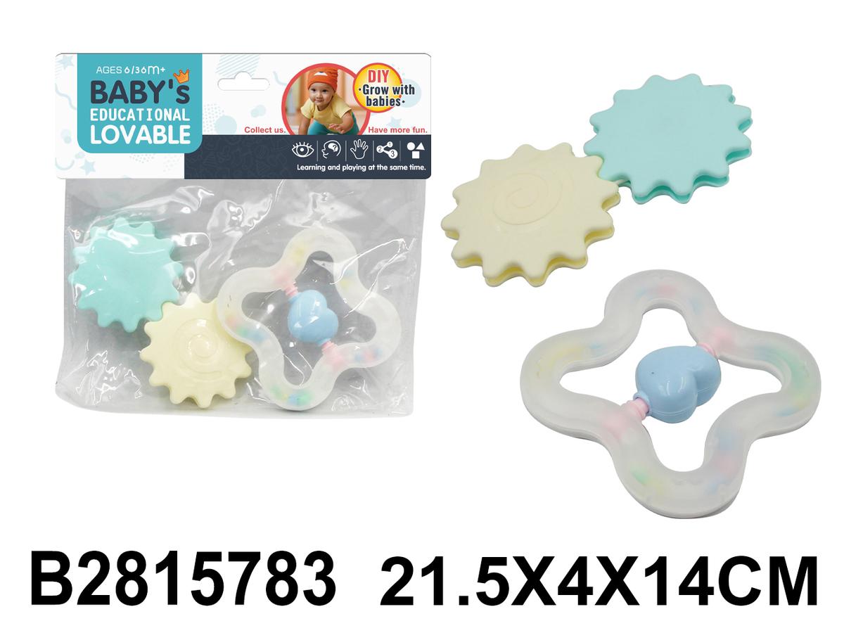 - Две шестерёнкообразные погремушки разных цветов (светло-бирюзового и кремового оттенков) с интересным рельефом для тактильного изучения.