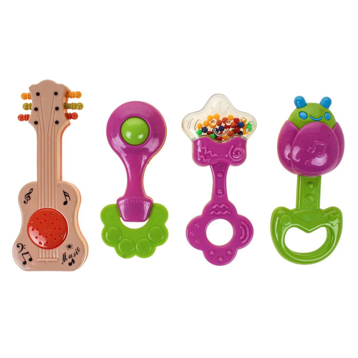 - Разнообразие форм и текстур: В наборе представлены погремушки разной формы (гитара, фигурки с петлями и отверстиями), что обеспечивает разнообразие тактильных ощущений и поддерживает интерес малыша.