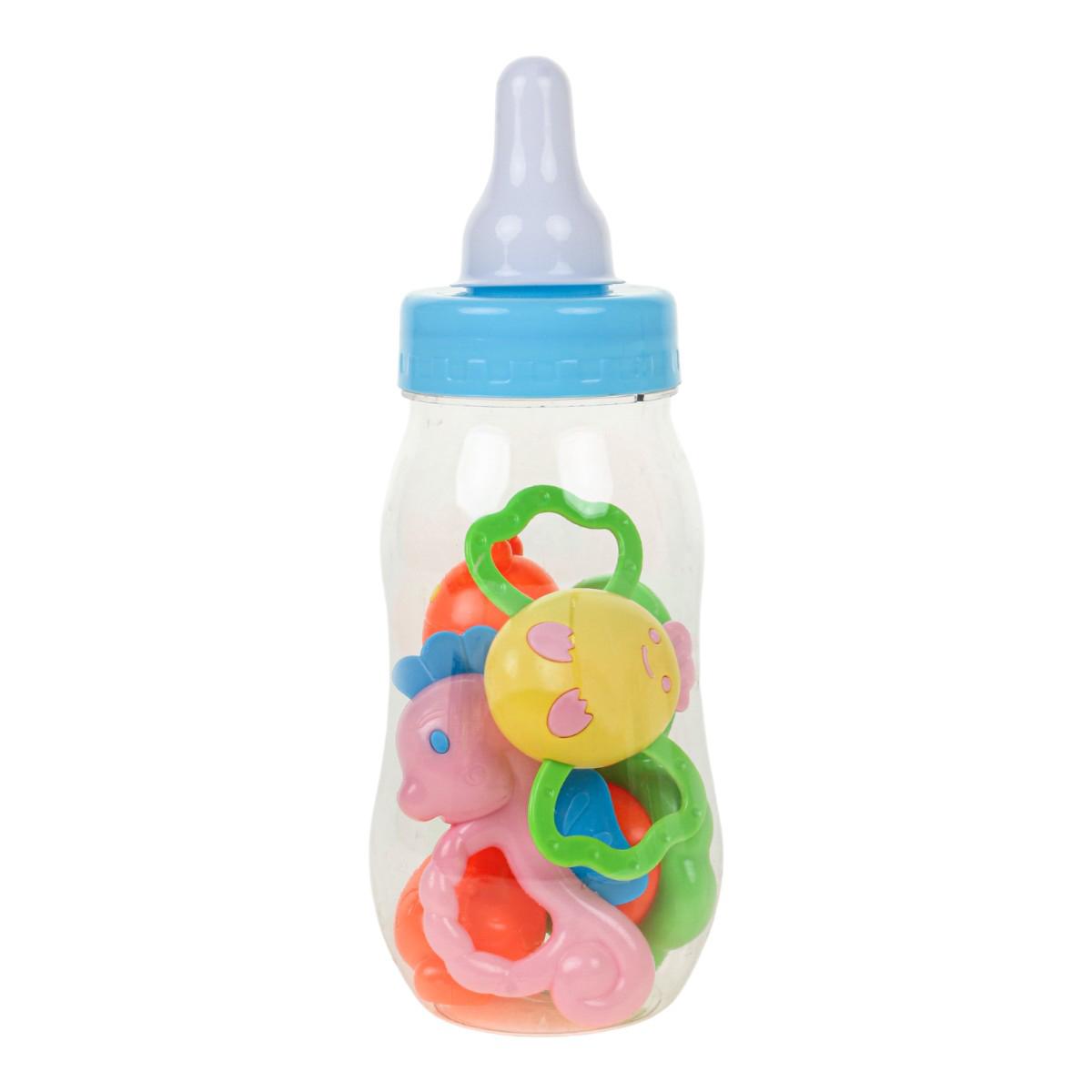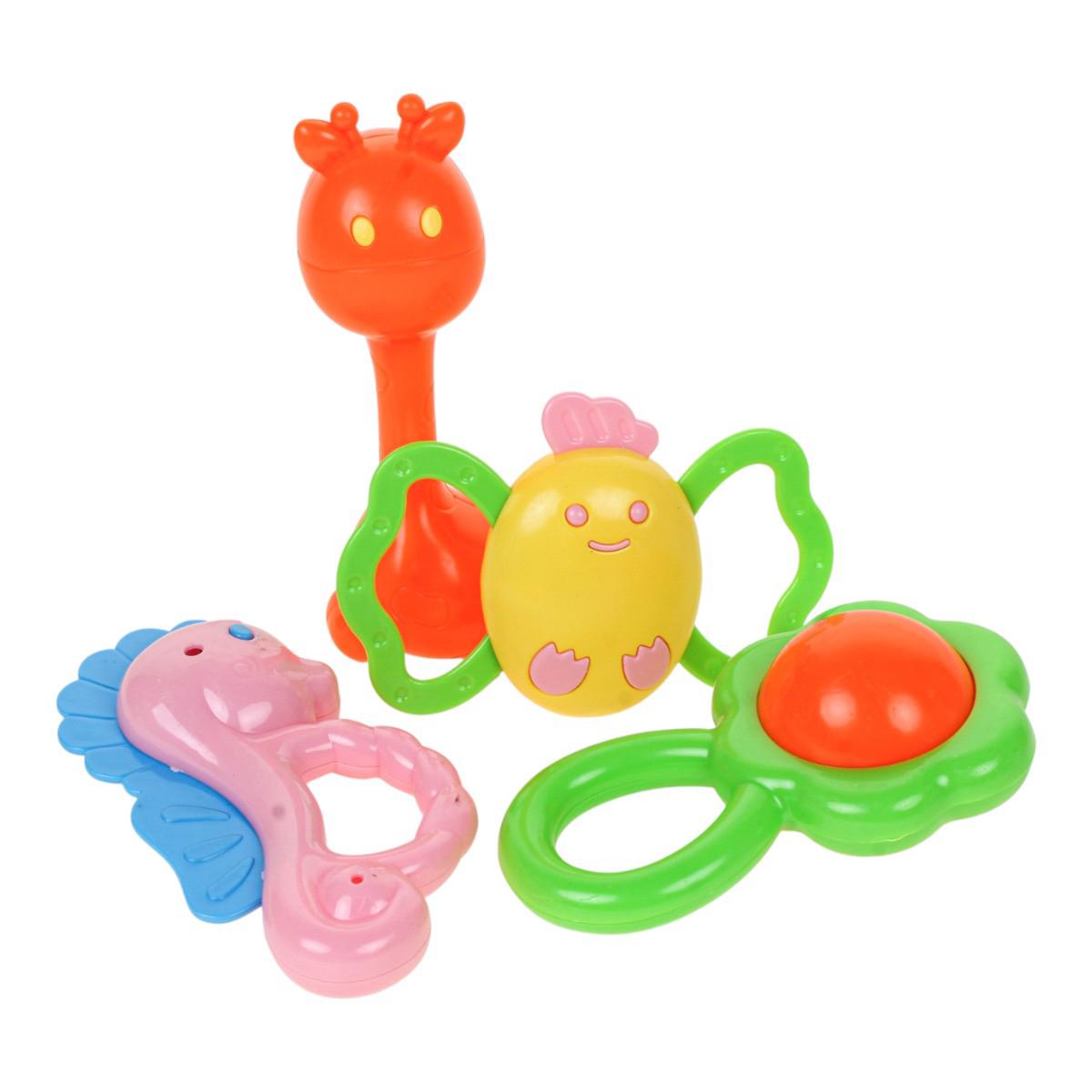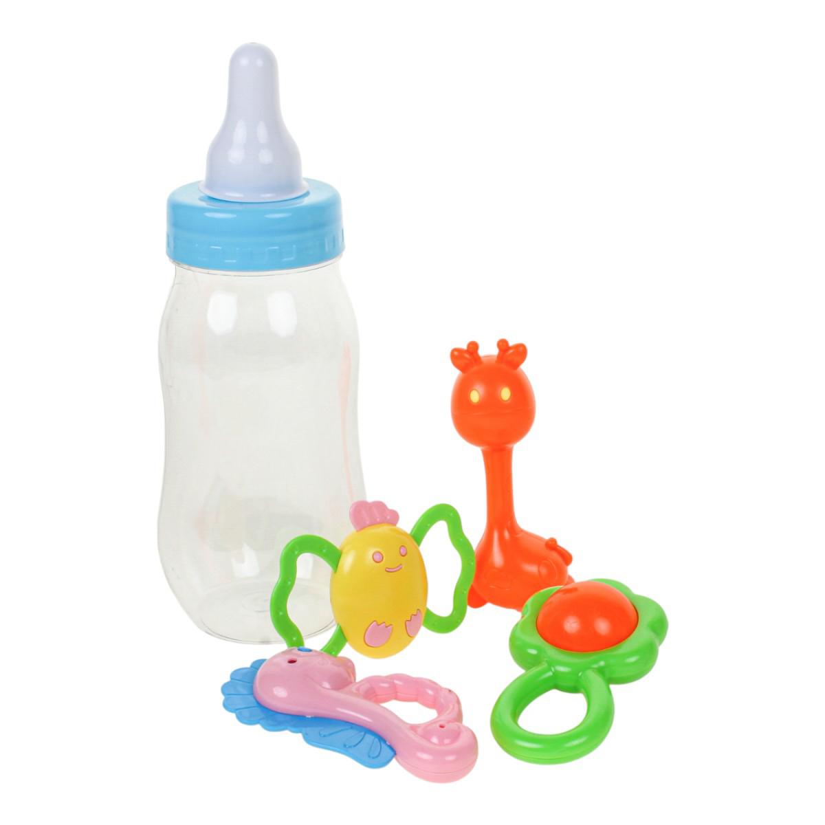 Этот набор погремушек и бутылочка предназначен для первых игр и развития ребёнка. Яркие погремушки из пластика стимулируют зрительное и слуховое восприятие, развивают пространственное мышление, а также моторику и тактильные ощущения. В набор входит 4 ярких погремушки в формах цветов, морских существ и фруктов, а также прозрачная бутылочка для кормления с удобной крышкой и соском.