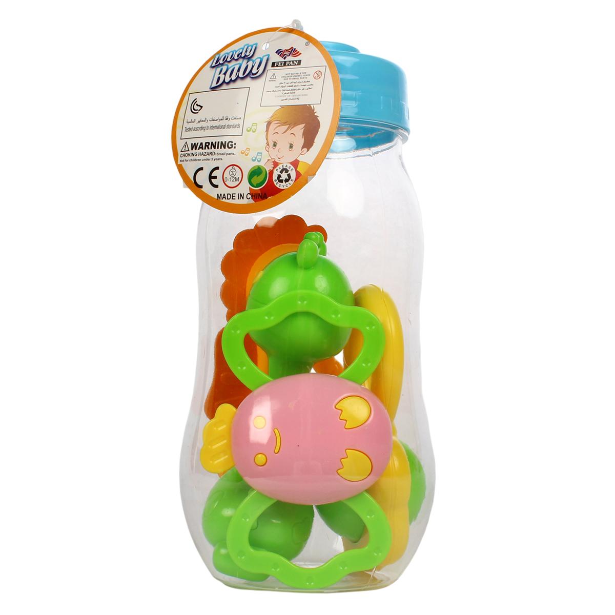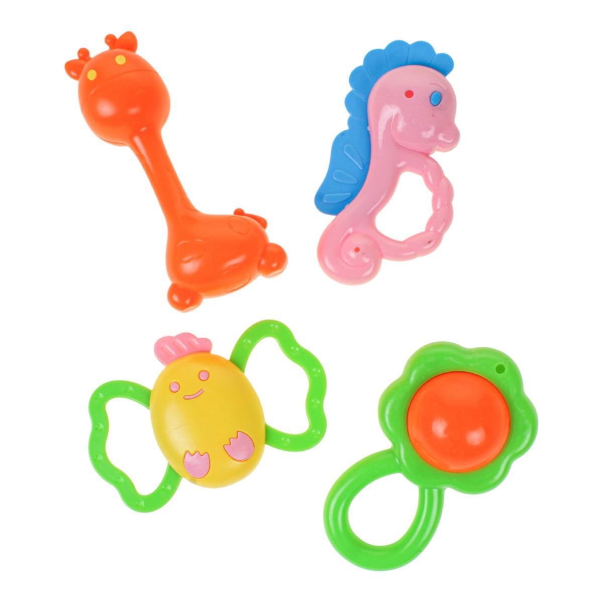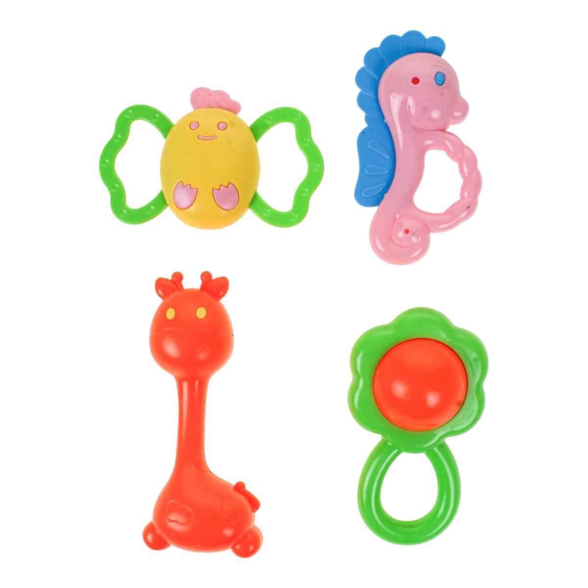 Этот набор погремушек и бутылочка предназначен для первых игр и развития ребёнка. Яркие погремушки из пластика стимулируют зрительное и слуховое восприятие, развивают пространственное мышление, а также моторику и тактильные ощущения. В набор входит 4 ярких погремушки в формах цветов, морских существ и фруктов, а также прозрачная бутылочка для кормления с удобной крышкой и соском.