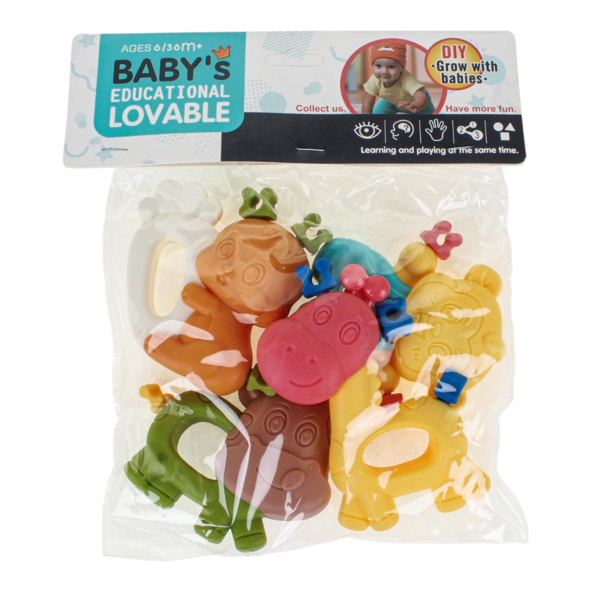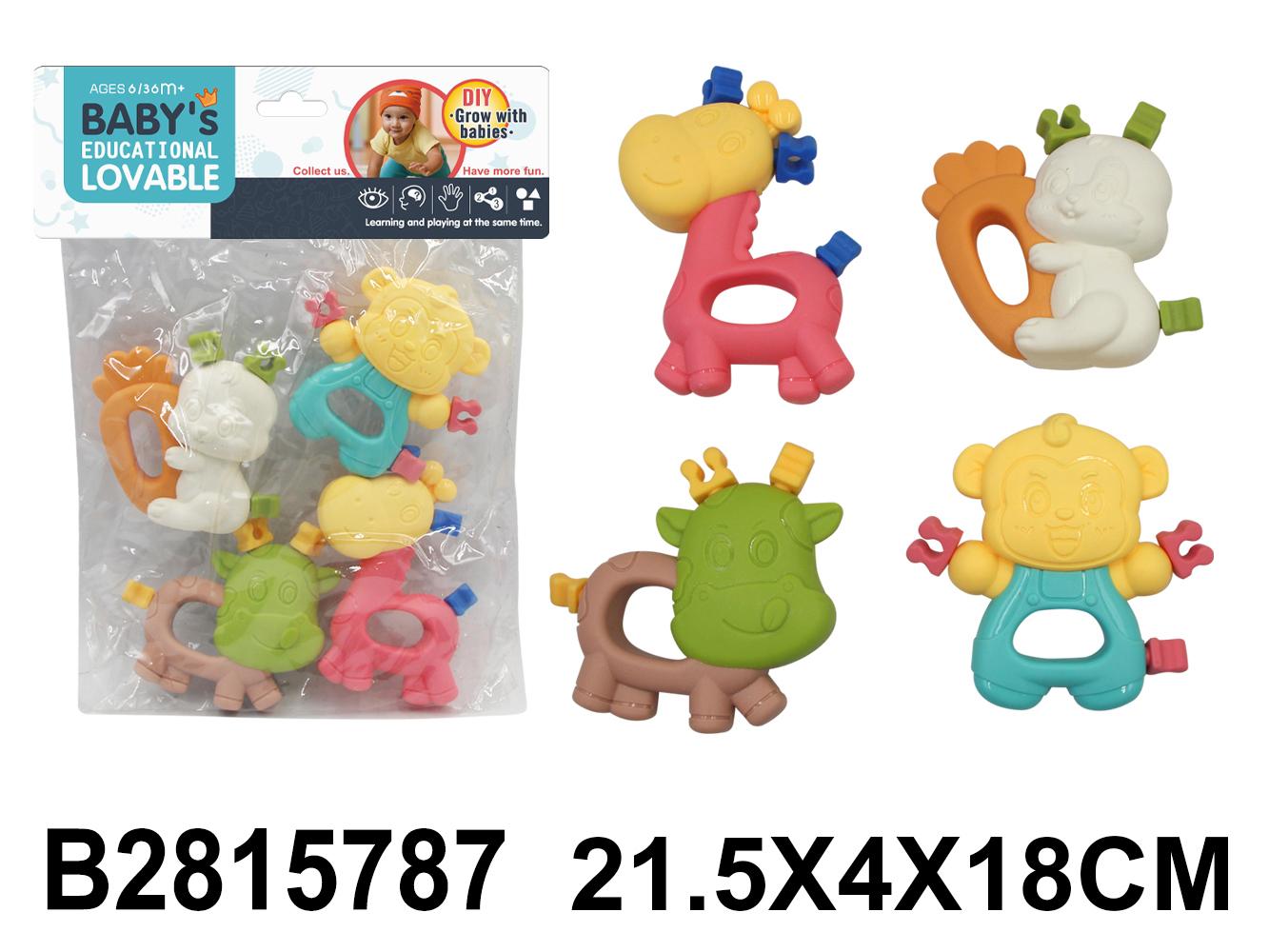 - Яркие персонажи: Погремушки выполнены в виде забавных мультяшных животных и персонажей в сочных цветах, которые привлекают внимание малыша и вызывают интерес.