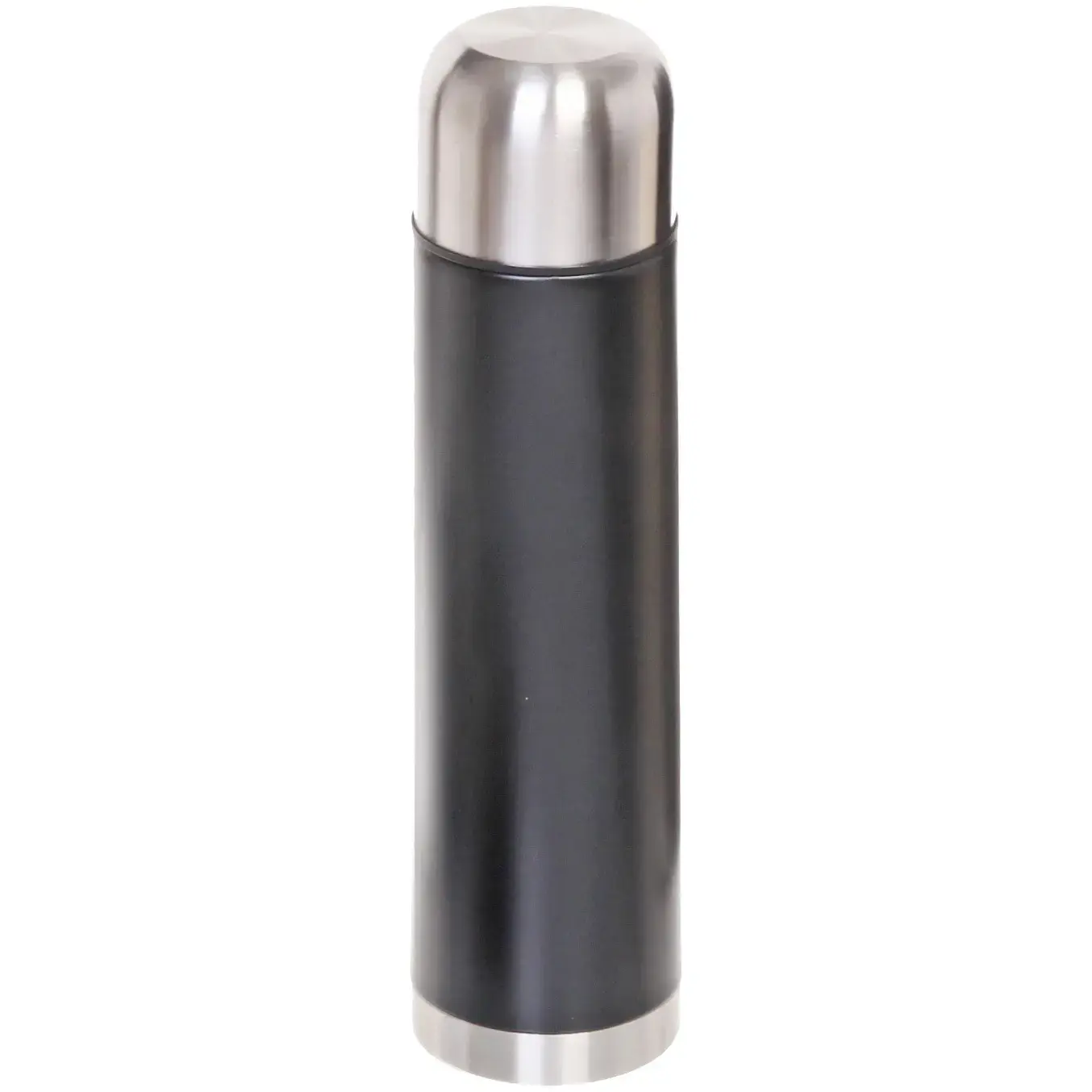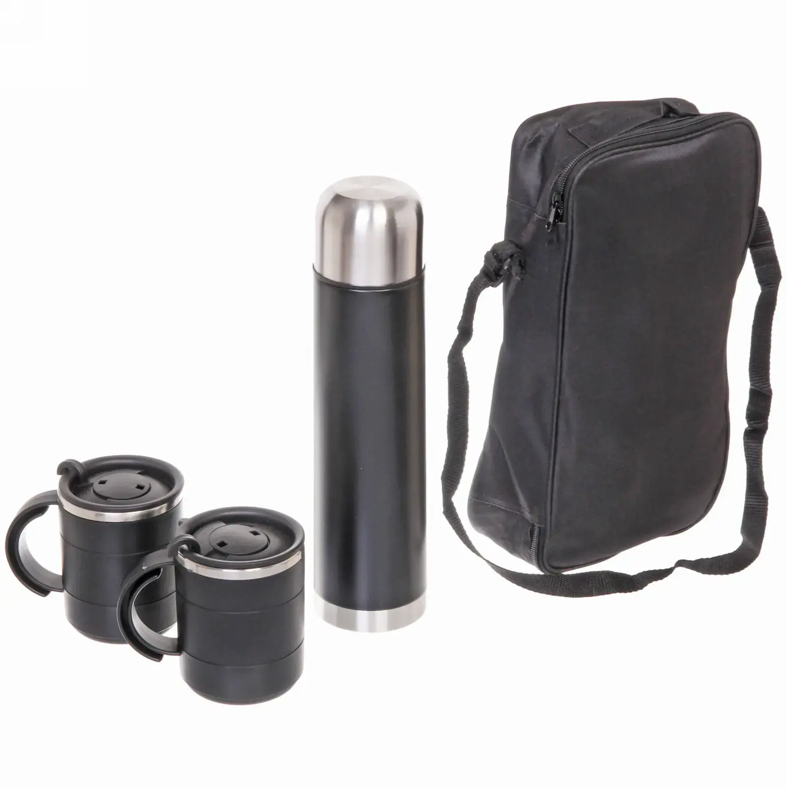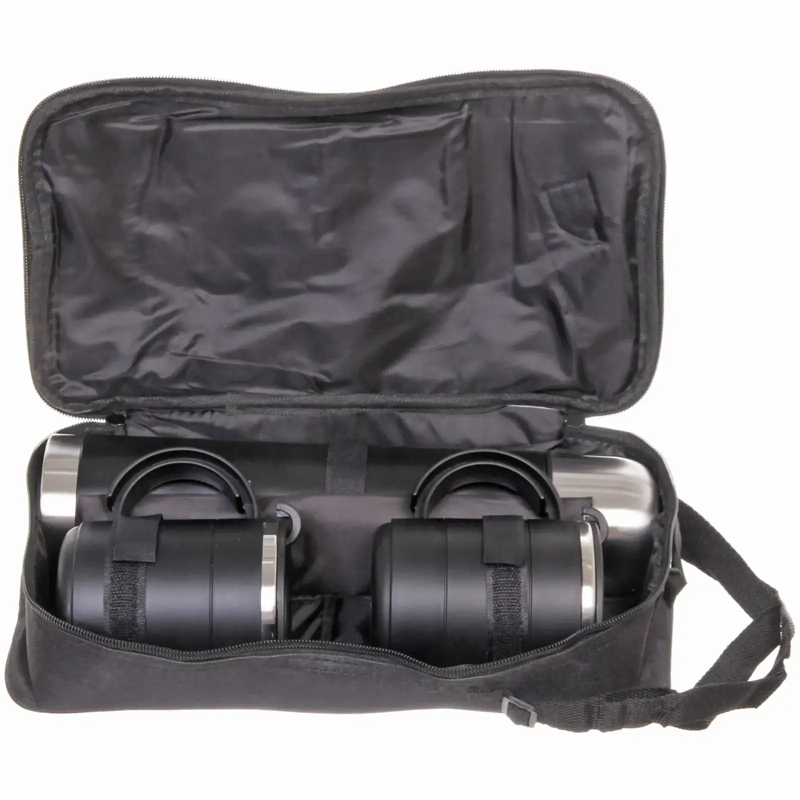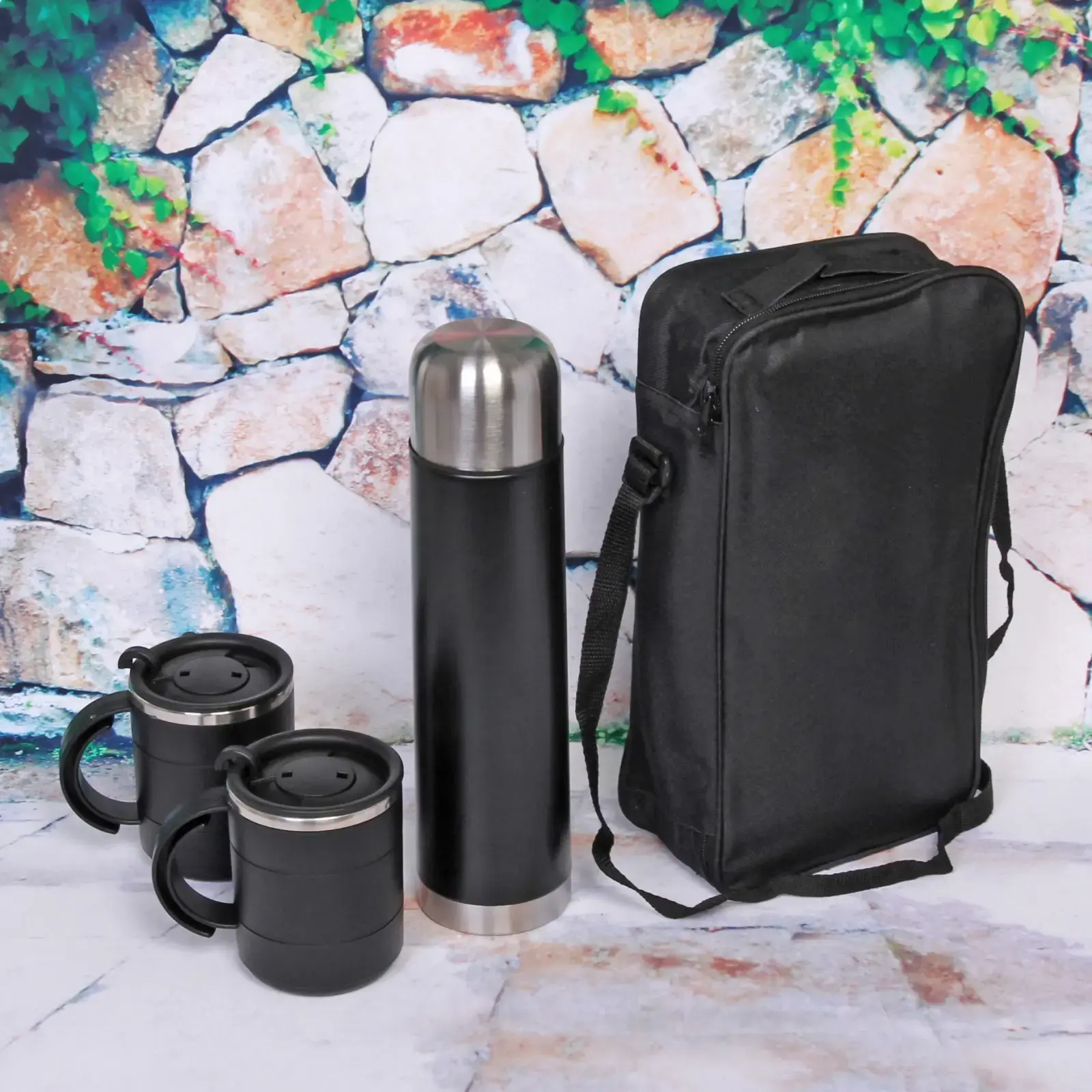 Термос имеет высокую цилиндрическую форму с черным матовым корпусом и металлической крышкой, что обеспечивает отличную теплоизоляцию. Кружки также черного цвета, с удобными ручками и крышками, которые предотвращают проливание. Сумка выполнена из прочного текстиля, что делает ее устойчивой к износу и легкой в уходе. Размеры термоса и кружек стандартные, что позволяет легко их использовать в повседневной жизни.