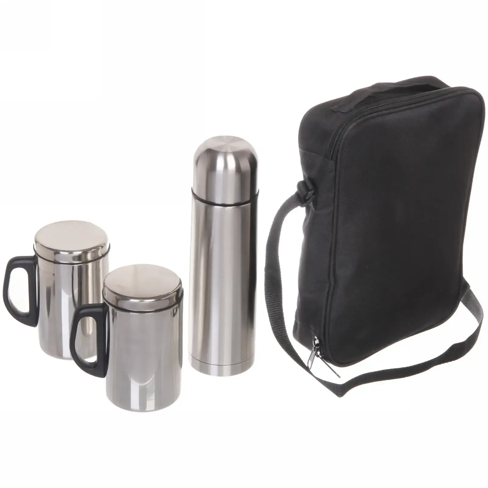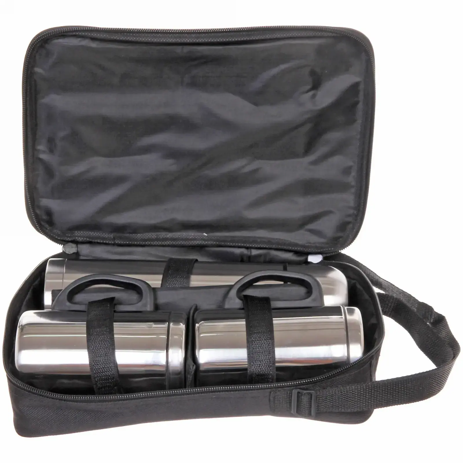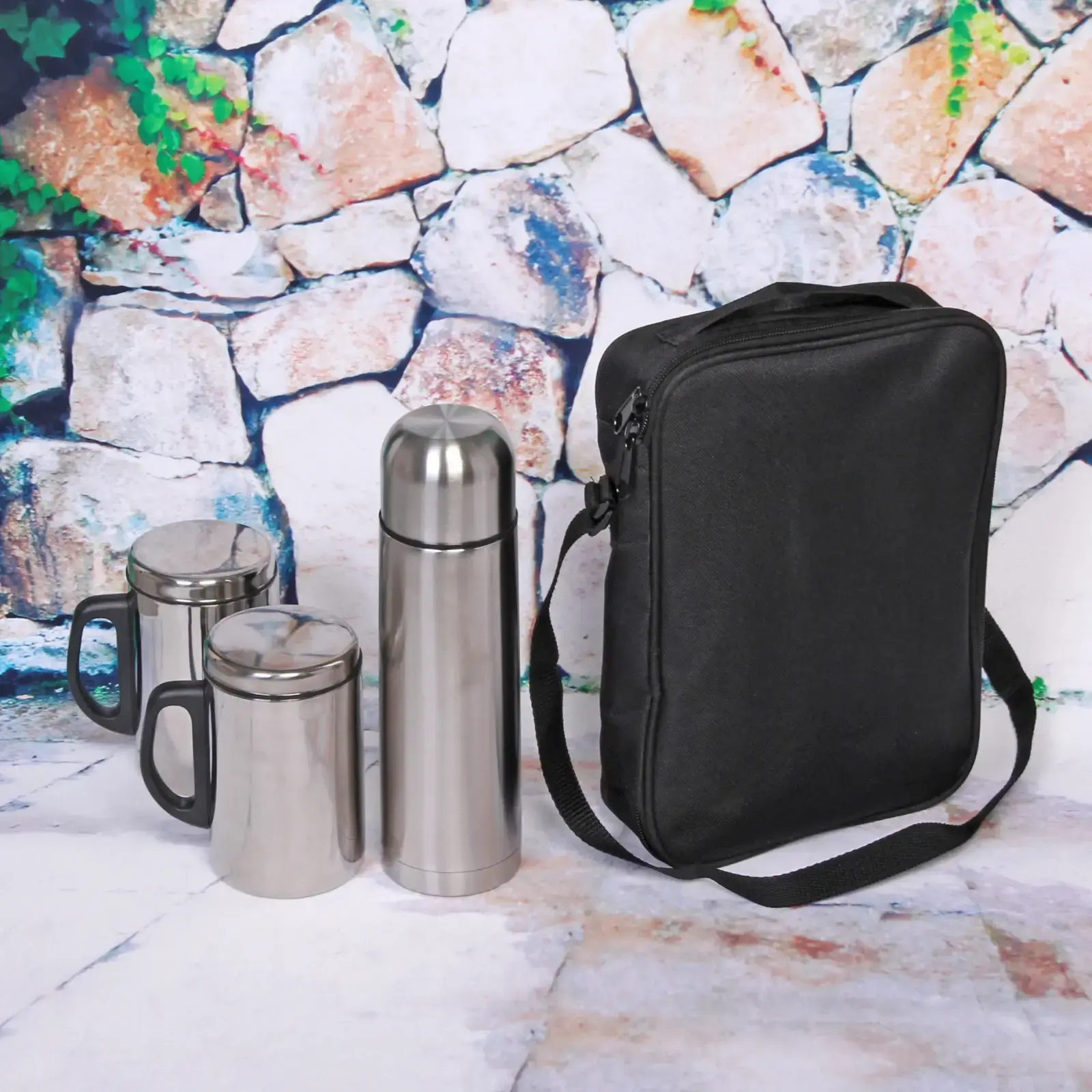 Набор предназначен для использования в поездках, на природе или во время активного отдыха. Термос и кружки выполнены из нержавеющей стали, что гарантирует долговечность и надежность. Они легко помещаются в черный текстильный чехол с ручкой и застежкой-молнией, что упрощает транспортировку.