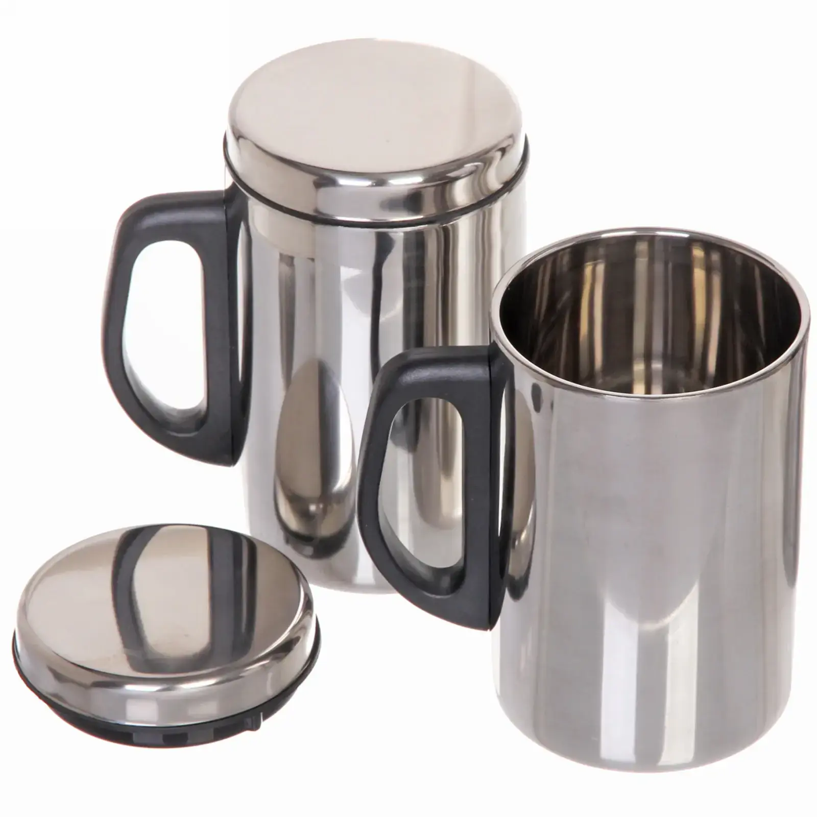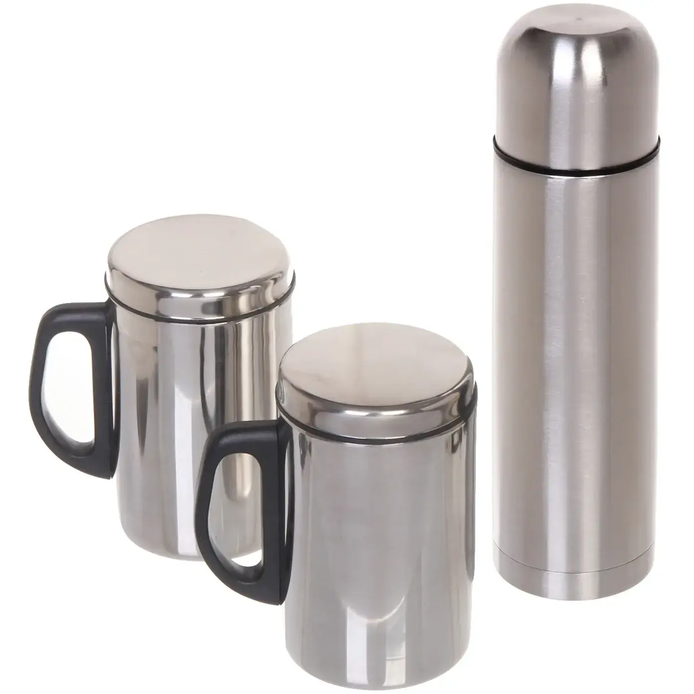 - Гладкая металлическая поверхность термоса и кружек обеспечивает легкость в уходе.