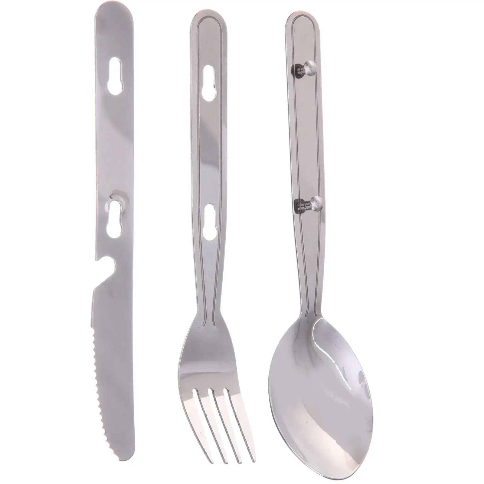 Приборы имеют тонкие, длинные ручки с отверстиями, что позволяет удобно крепить их или подвешивать. Нож с комбинированной конструкцией, вилка с тремя зубцами и ложка с округлой чашей — все элементы набора выполнены с учетом функциональности и удобства. Размеры приборов стандартные, что делает их удобными для использования в любых условиях.