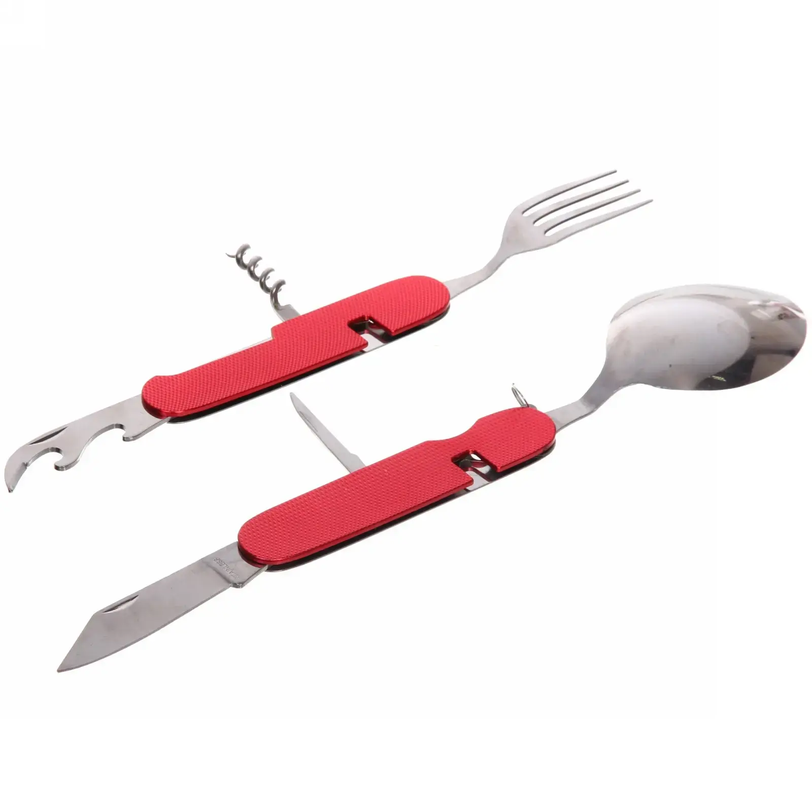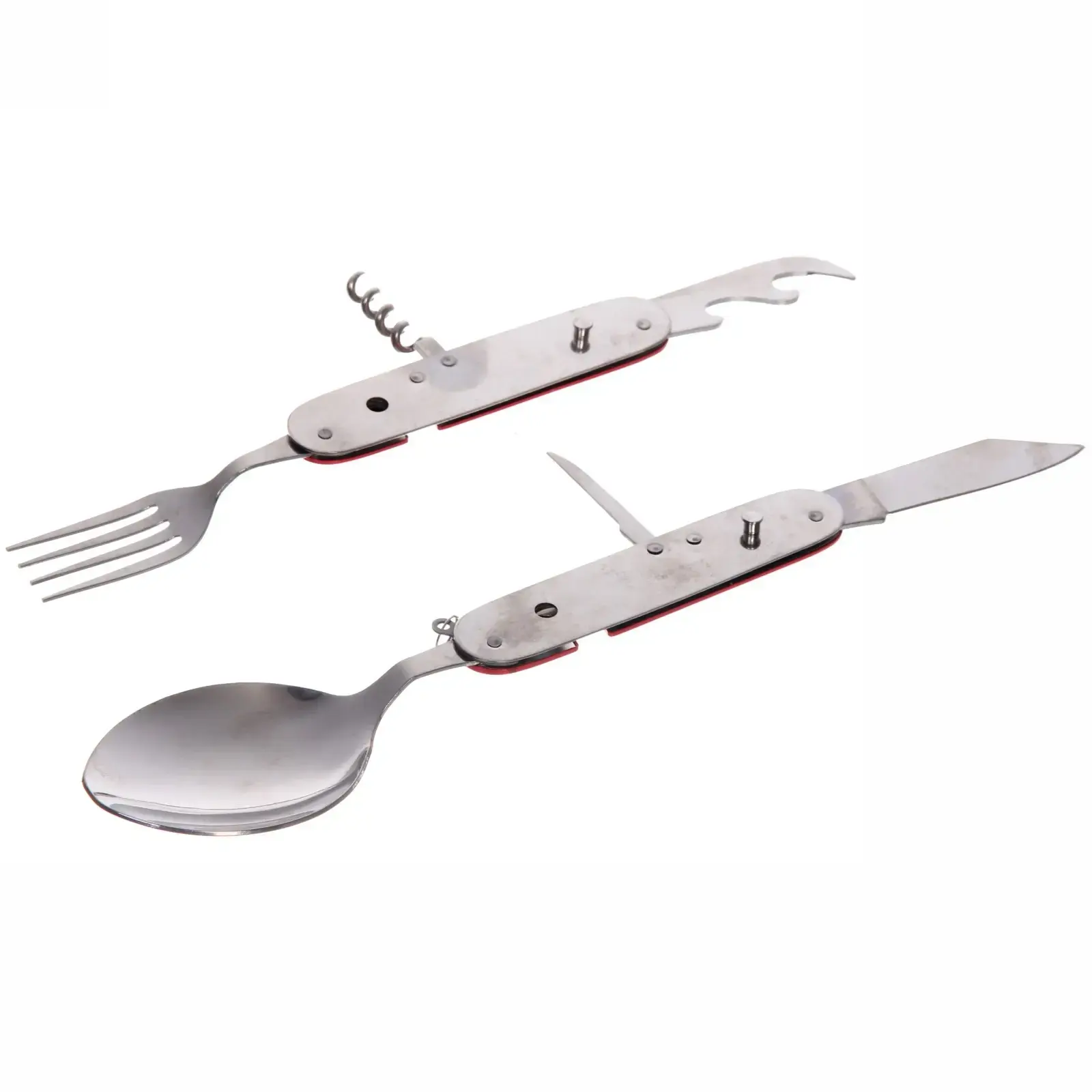 - Всё необходимое в одном инструменте: вилка, ложка, нож, открывалка, штопор и карабин для крепления