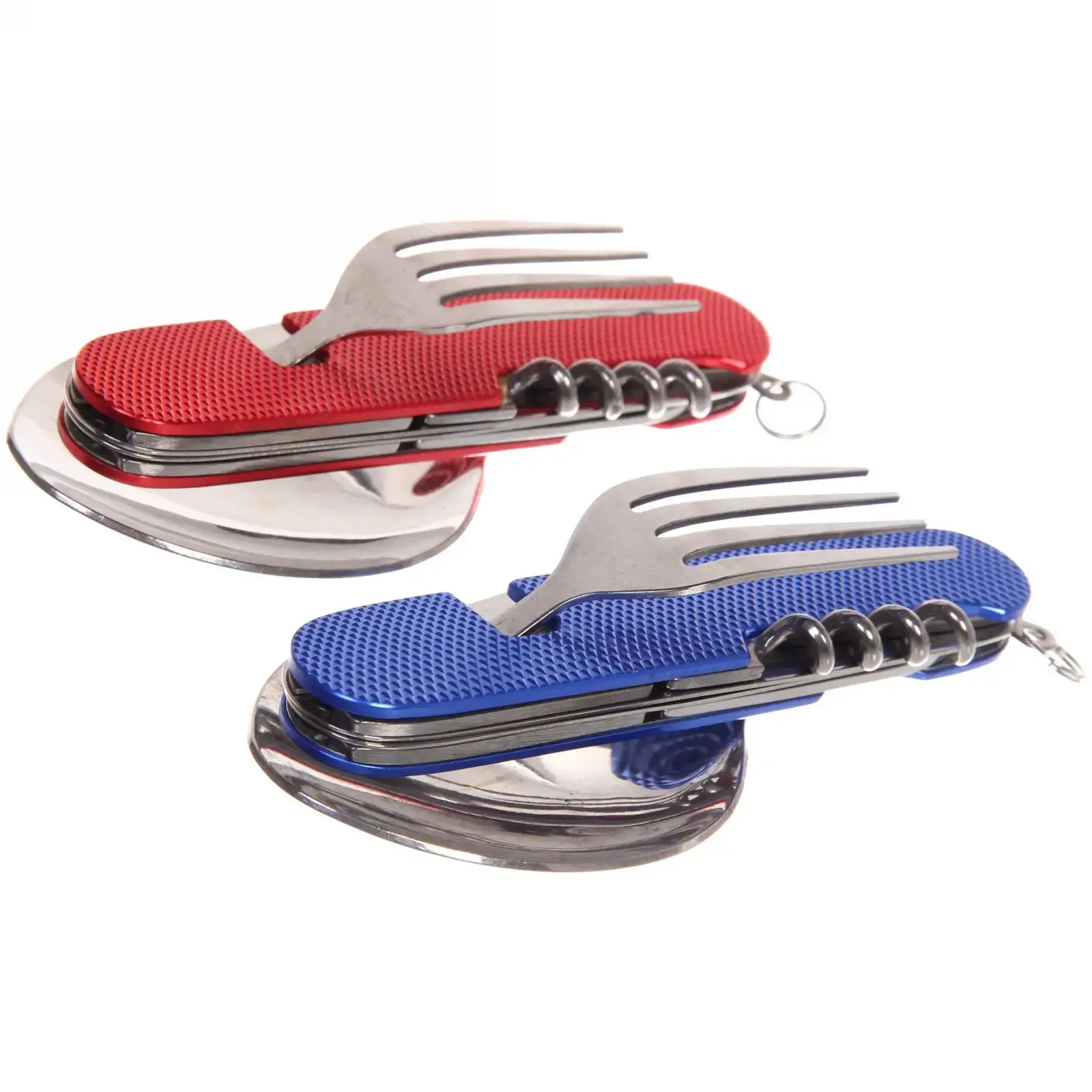 Многофункциональный дизайн экономит место в рюкзаке: сложенные приборы занимают не больше места, чем обычный складной нож. Яркие цветовые акценты (красный и синий) помогают быстро найти набор среди вещей.