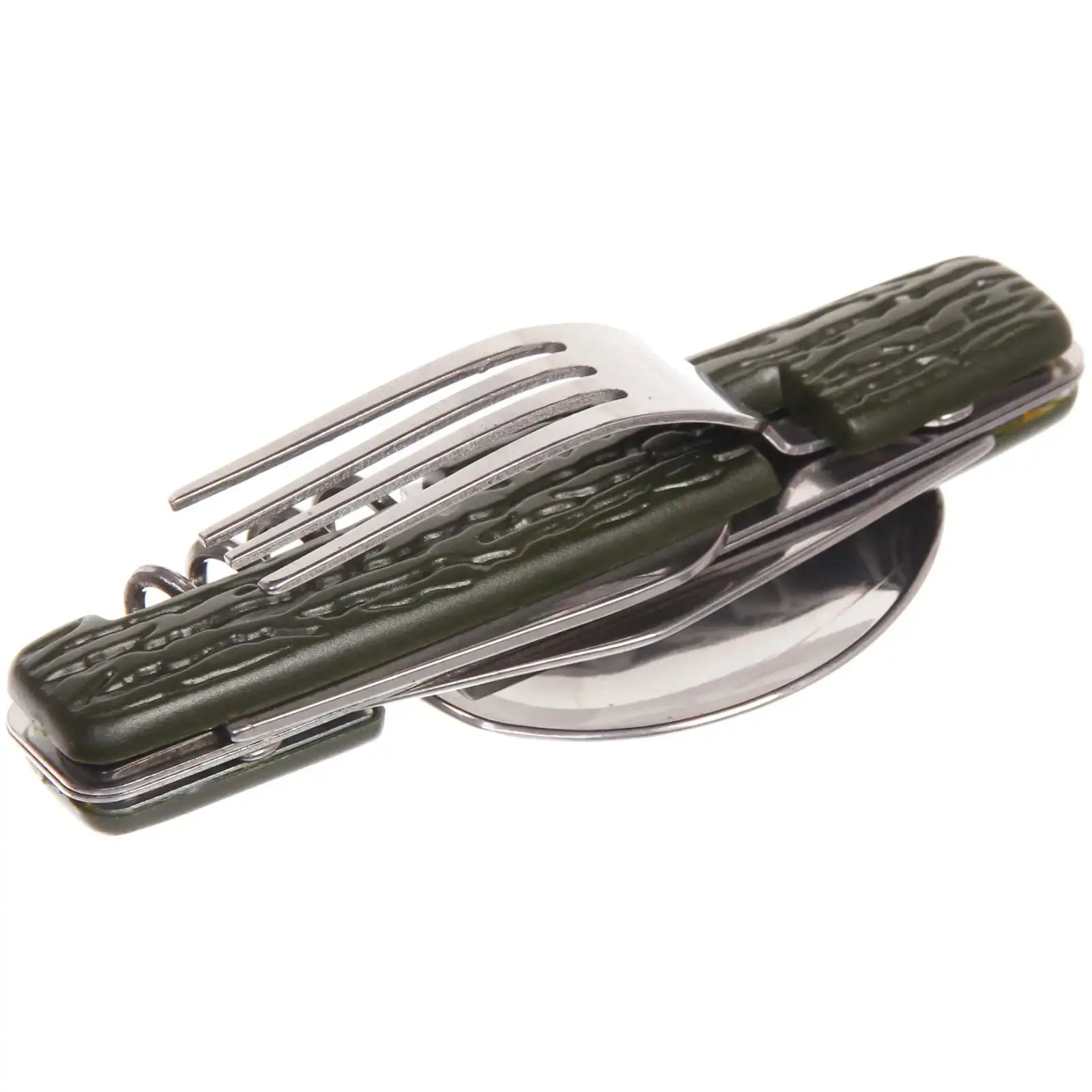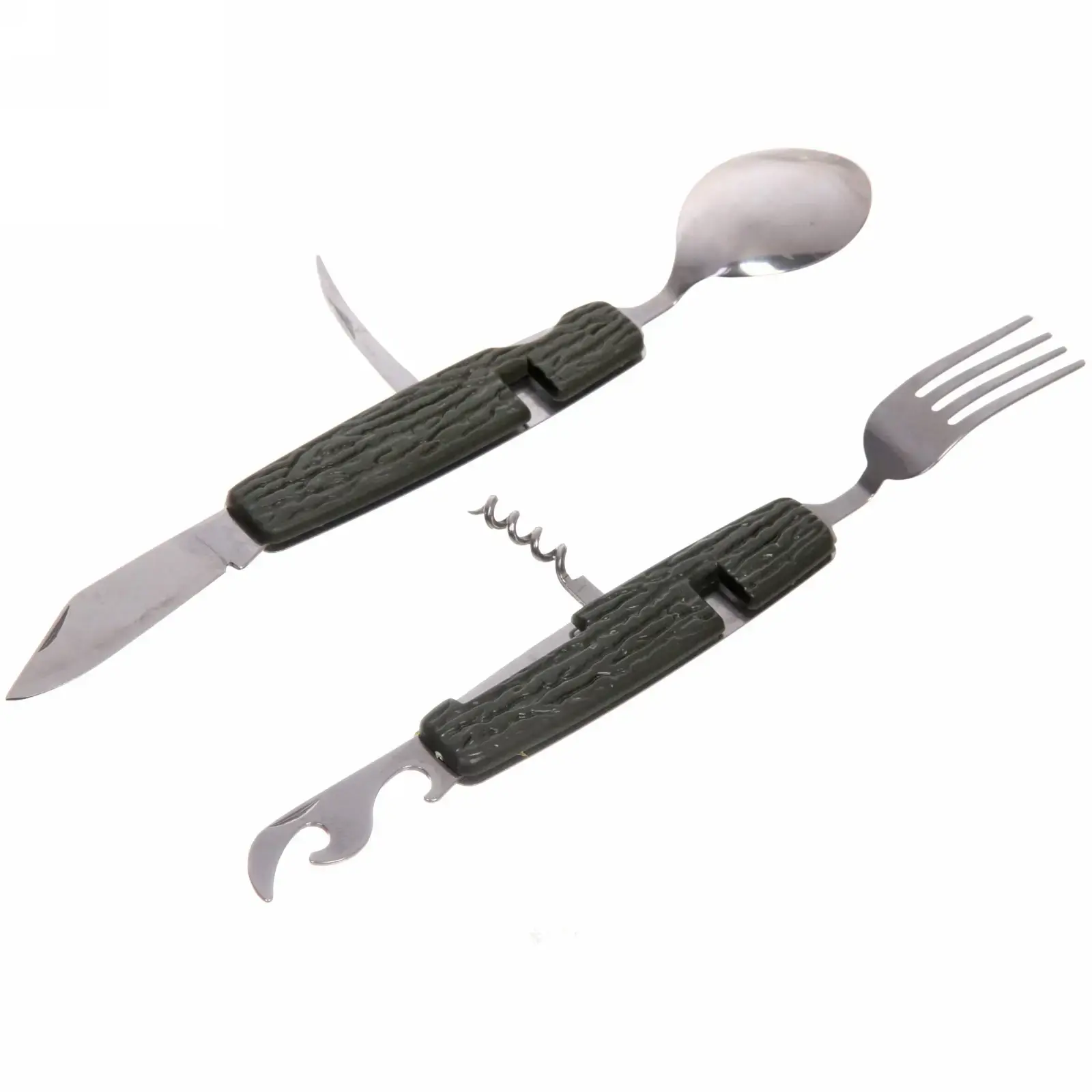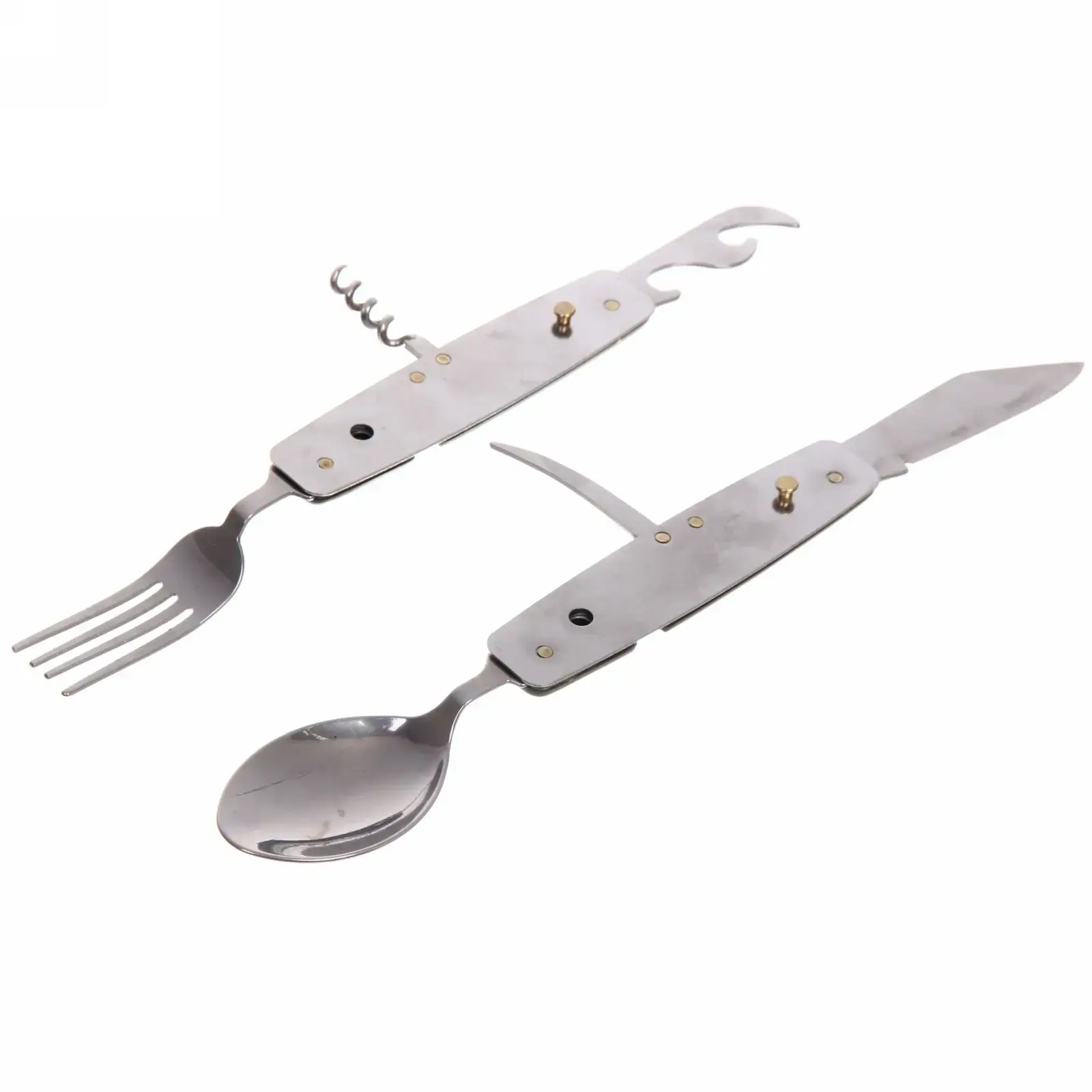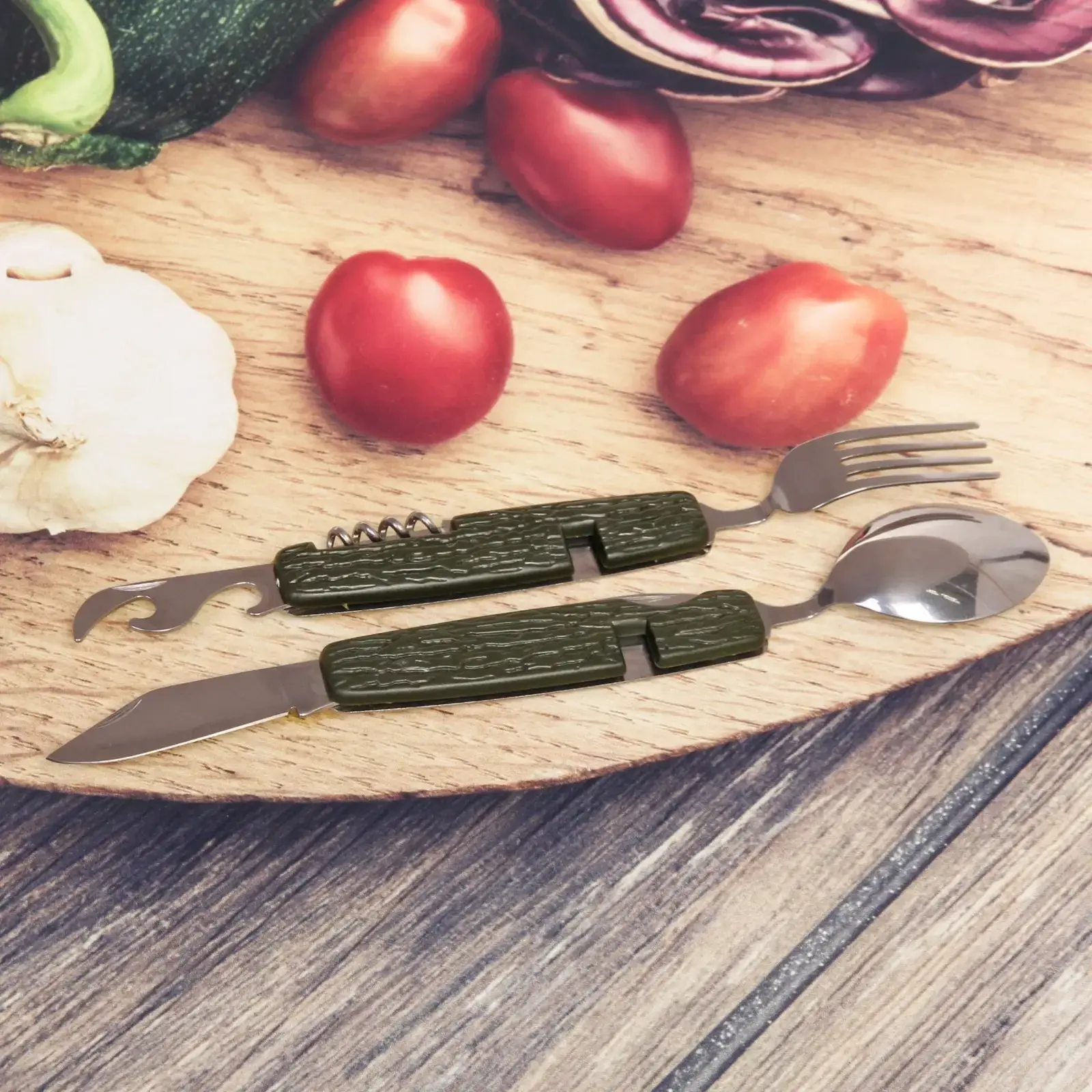 В набор входят: острый нож с зазубренным лезвием, вилка с тремя зубцами, глубокая ложка, открывалка для бутылок, штопор и универсальный крюк. Все элементы складываются в единый блок размером с обычный столовый прибор.