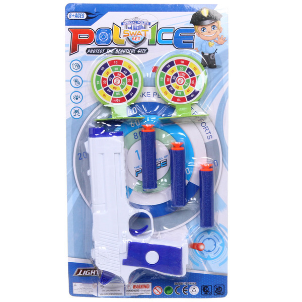 Набор предназначен для детей от 6 лет и включает в себя белый пластиковый пистолет с синими деталями, три игрушечных стрелы-боеприпаса и две мишени. Мишени оформлены в яркие цвета, что делает их заметными и привлекательными для детей. Пистолет и мишени имеют стандартные размеры, что обеспечивает удобство в игре.