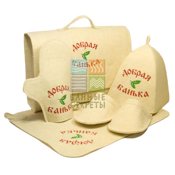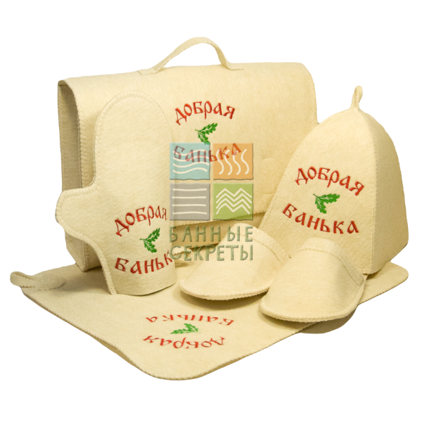 Все элементы выполнены в светло-бежевом цвете и оформлены вышивкой «Добрая банька» с декоративным элементом в виде дубового листа. Края обработаны оверлочным швом для аккуратного внешнего вида и дополнительной износостойкости. Портфель облегчает хранение набора и помогает поддерживать порядок среди банных принадлежностей.