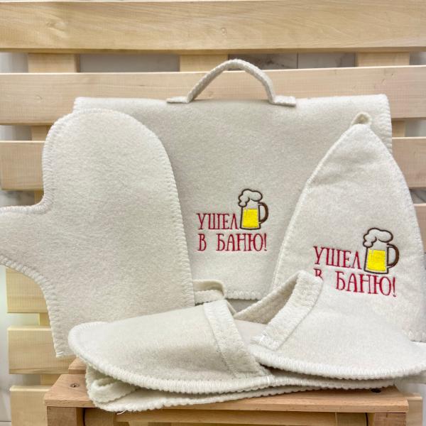 Все изделия выполнены из плотного войлока светло-бежевого цвета с аккуратной обработкой краев. Материал хорошо подходит для банных процедур: он помогает сохранить комфортную температуру, защищает кожу и обеспечивает приятные тактильные ощущения. Портфель позволяет хранить аксессуары в одном месте и удобно брать их с собой в баню или сауну.