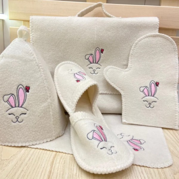 Изделия выполнены в светло-бежевом цвете и оформлены аккуратной вышивкой в виде зайки с закрытыми глазами и декоративными ушками. Единый стиль создаёт гармоничный образ, а качественная обработка краёв придаёт аккуратный и долговечный вид. Набор помогает поддерживать гигиену, организовать пространство и сделать посещение бани более комфортным.