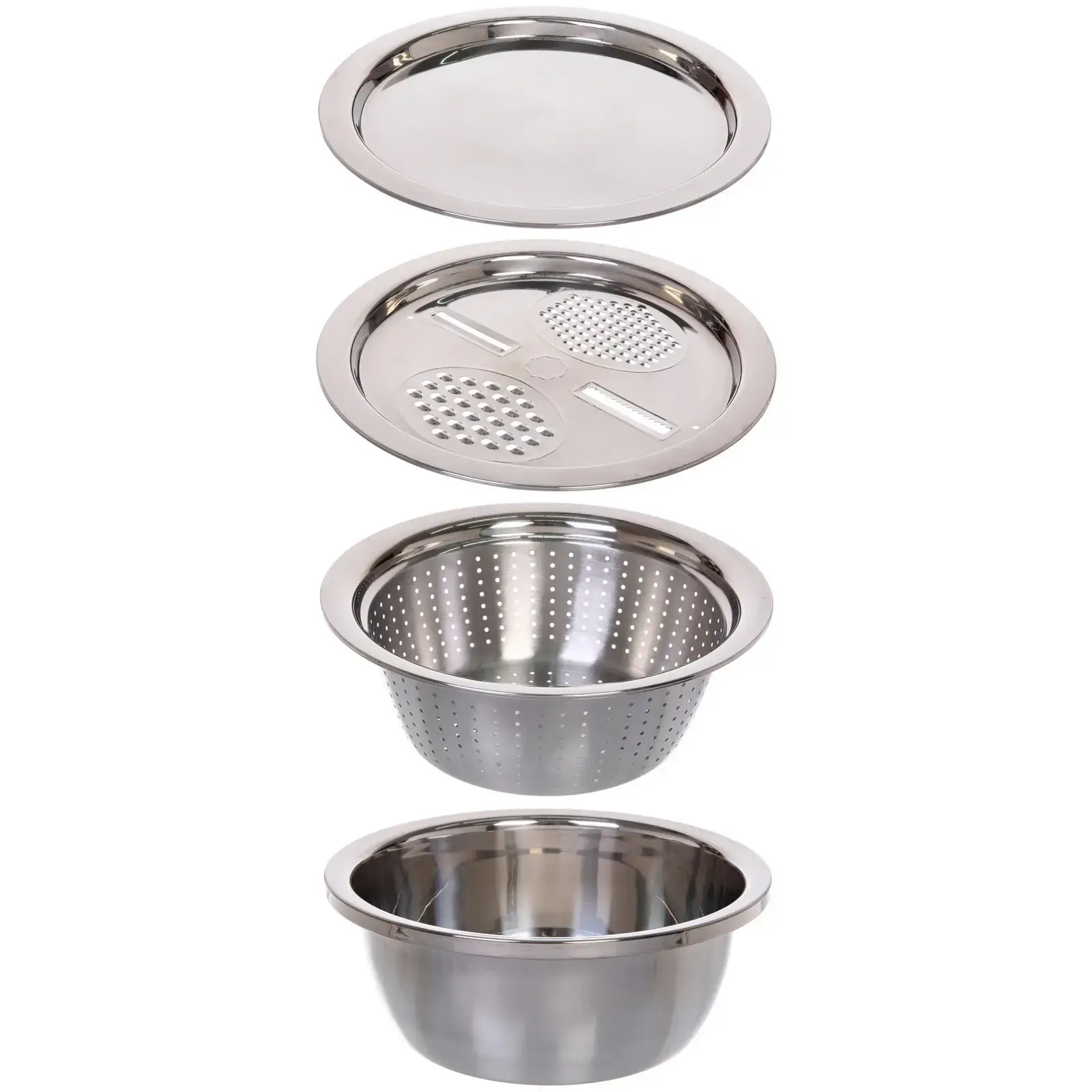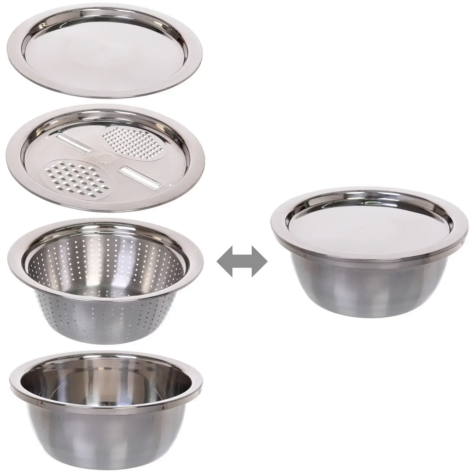 В комплект входят четыре предмета: глубокая миска, дуршлаг, терка и поднос. Миска идеально подходит для смешивания салатов, приготовления теста или маринадов, а также для хранения остатков еды в холодильнике. Дуршлаг с перфорацией позволяет удобно сливать жидкости, а терка с несколькими функциями упрощает процесс нарезки и натирания продуктов. Поднос обеспечивает удобство при подаче блюд.
