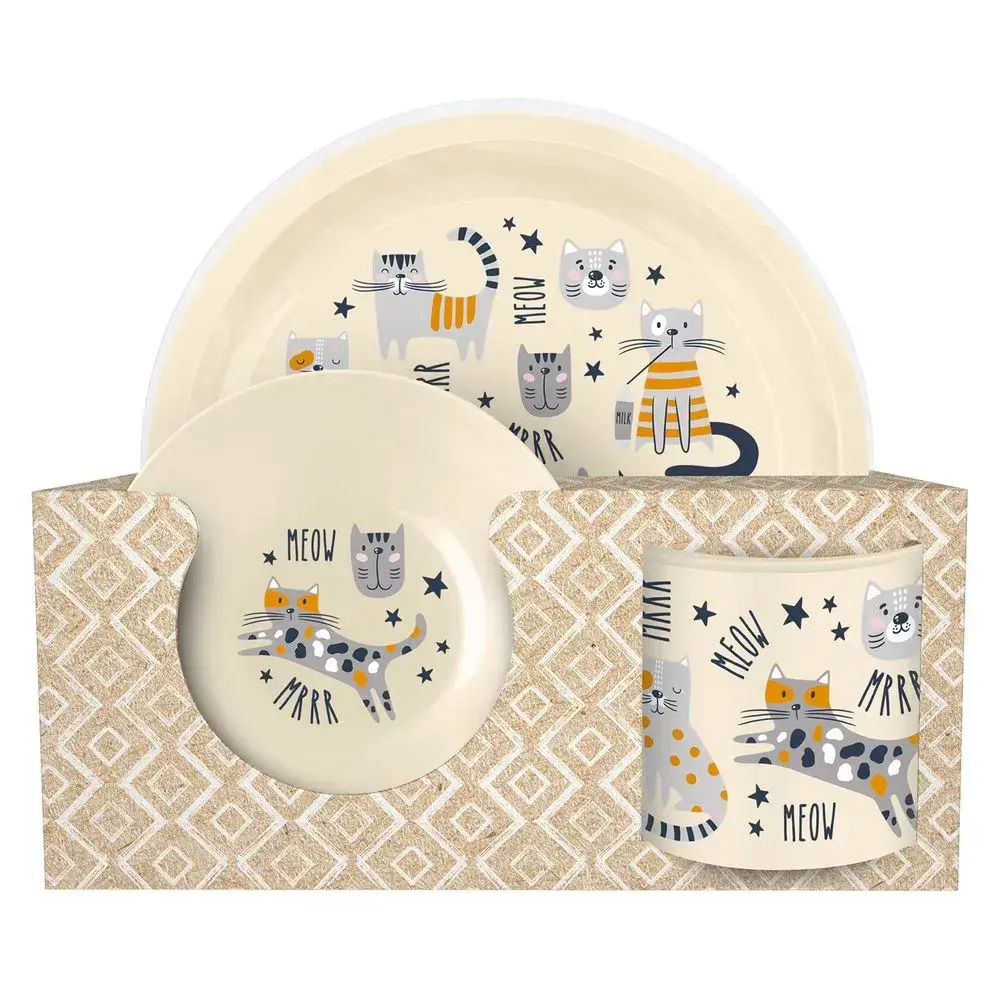 Откройте для себя комплект детской посуды с веселым декором «котики» — идеальный выбор для тех, кто ценит комфорт и заботу о детях. Уникальный дизайн с мультяшными кошками и надписями «MEOW» и «MRRR» подарит позитив даже обычному завтраку, а светло-бежевый цвет гармонично впишется в любой интерьер кухни. Ваш ребенок будет в восторге от милых рисунков и с удовольствием начнет самостоятельное питание.