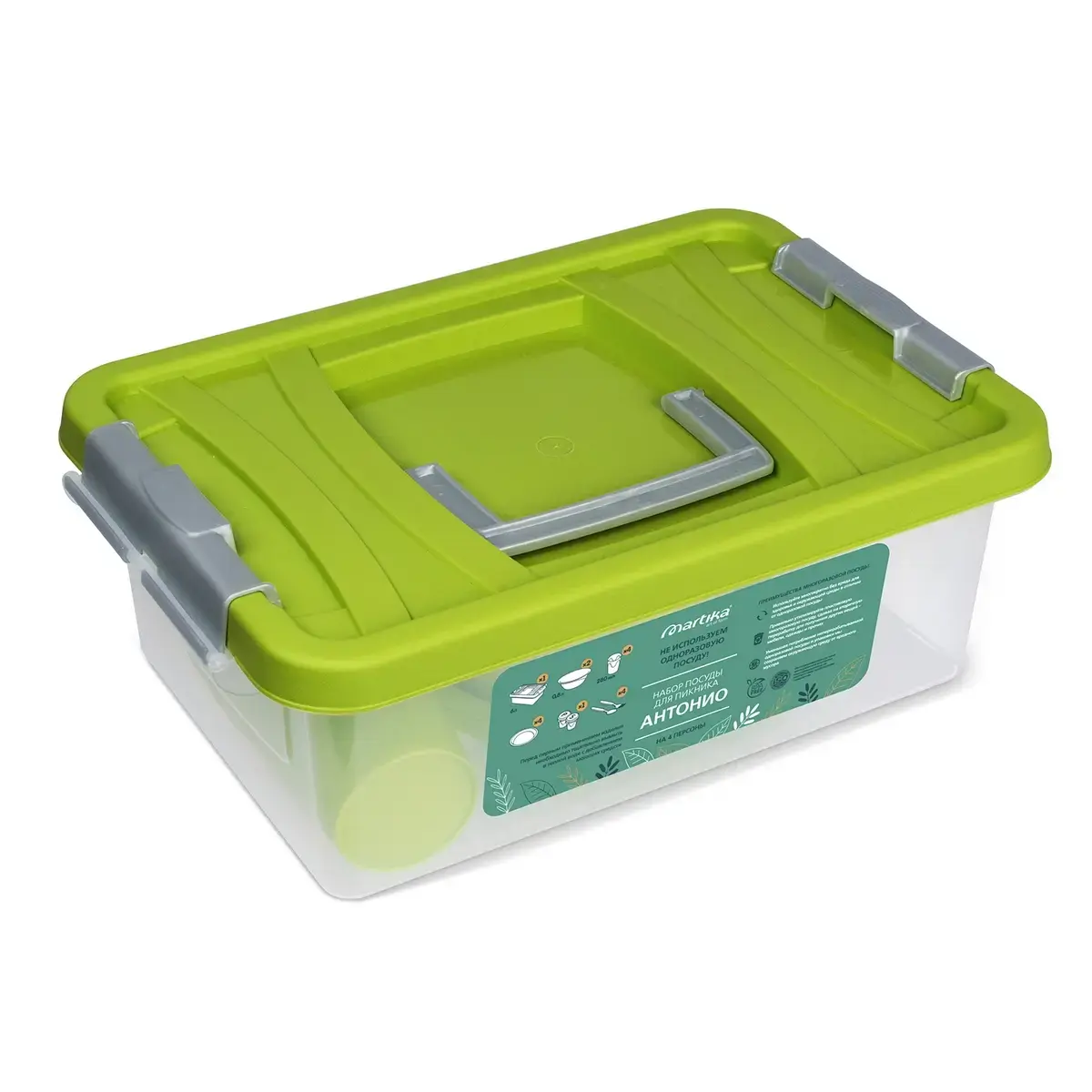 Проводите время на свежем воздухе с комфортом благодаря набору посуды для пикника «Антонио». В компактном пластиковом контейнере объемом 6 литров собраны все необходимые предметы для четырех человек.