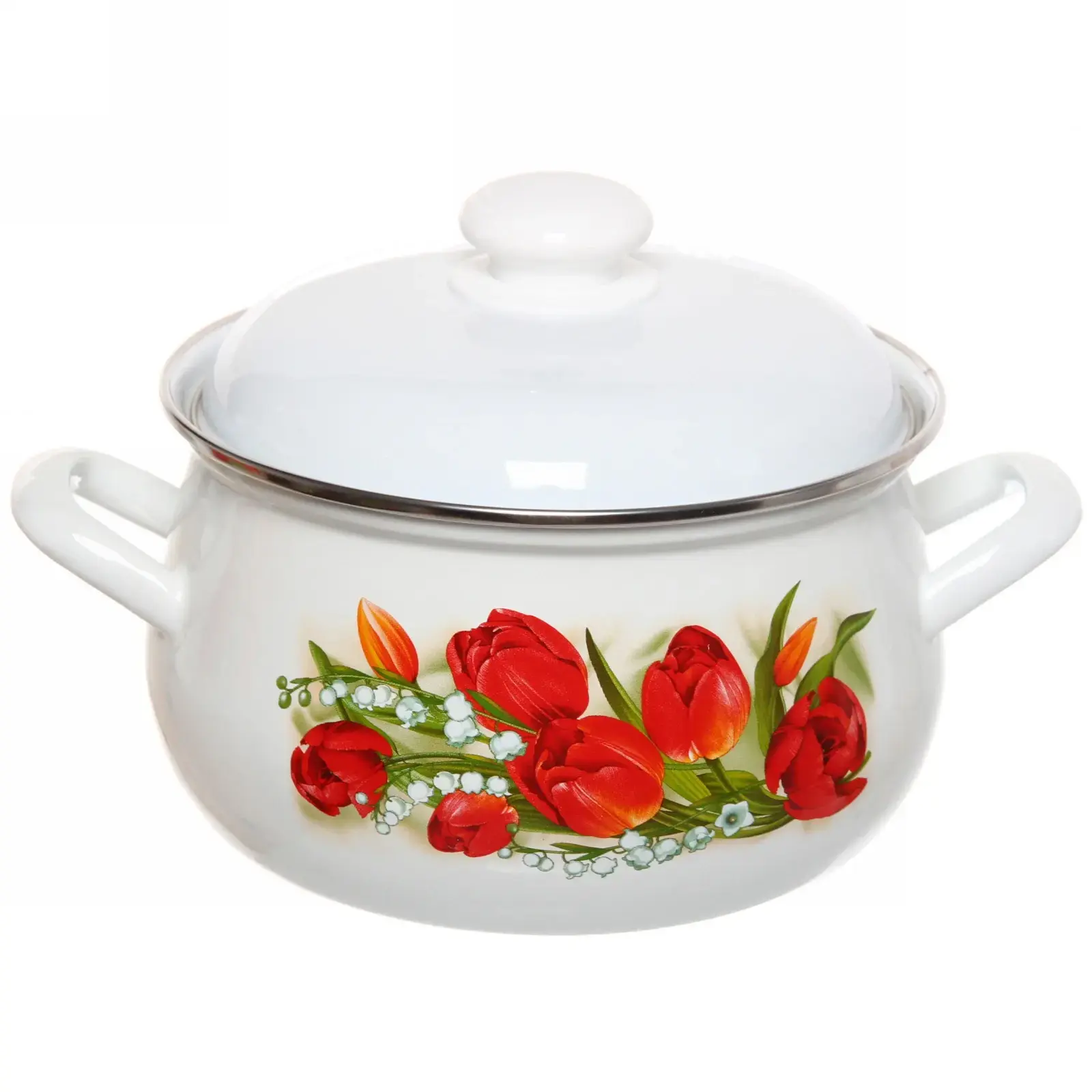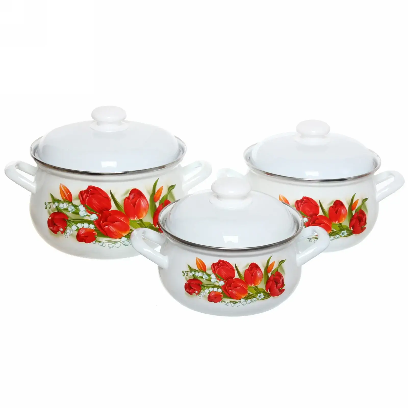 Этот набор посуды из трех кастрюль станет незаменимым помощником в приготовлении вкусных блюд. Эмаль, покрывающая кастрюли, обеспечивает надежность и долговечность, а также легкость в уходе. Сочетание белого цвета с ярким цветочным орнаментом из красных тюльпанов и зелени добавит уют и стиль в вашу кухню.