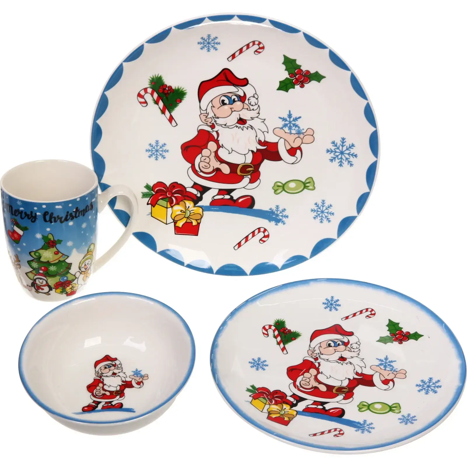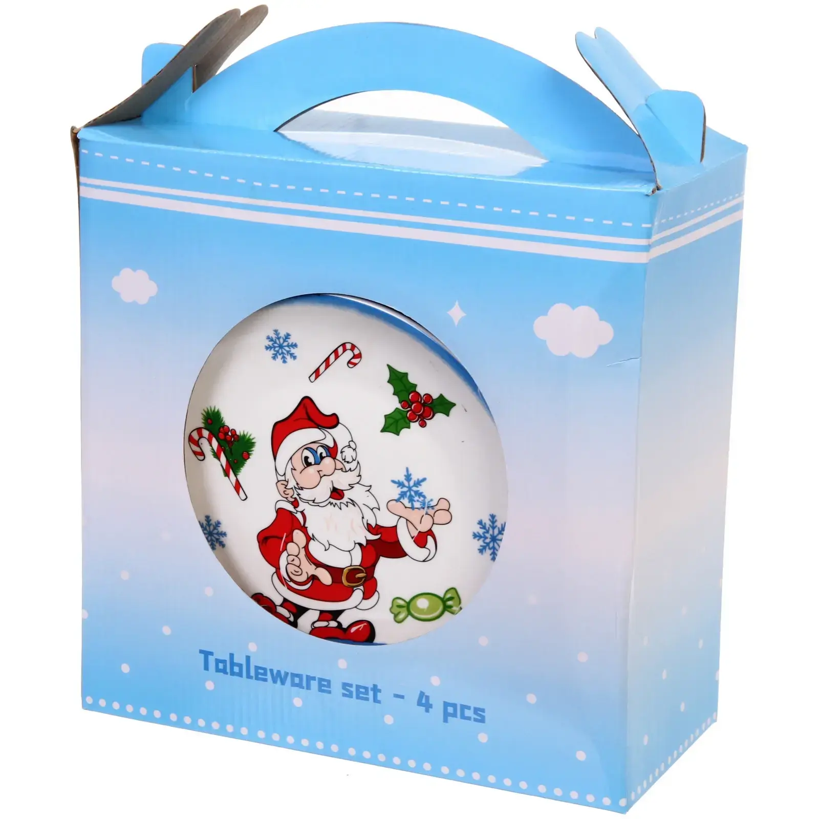 В набор входят четыре предмета: кружка объемом 330 мл, большая тарелка диаметром 25 см, средняя тарелка диаметром 20 см и салатник диаметром 13 см. Все предметы имеют яркий новогодний дизайн с изображением Деда Мороза, снежинок и других праздничных элементов, что делает их идеальными для сервировки блюд на Новый год и Рождество.
