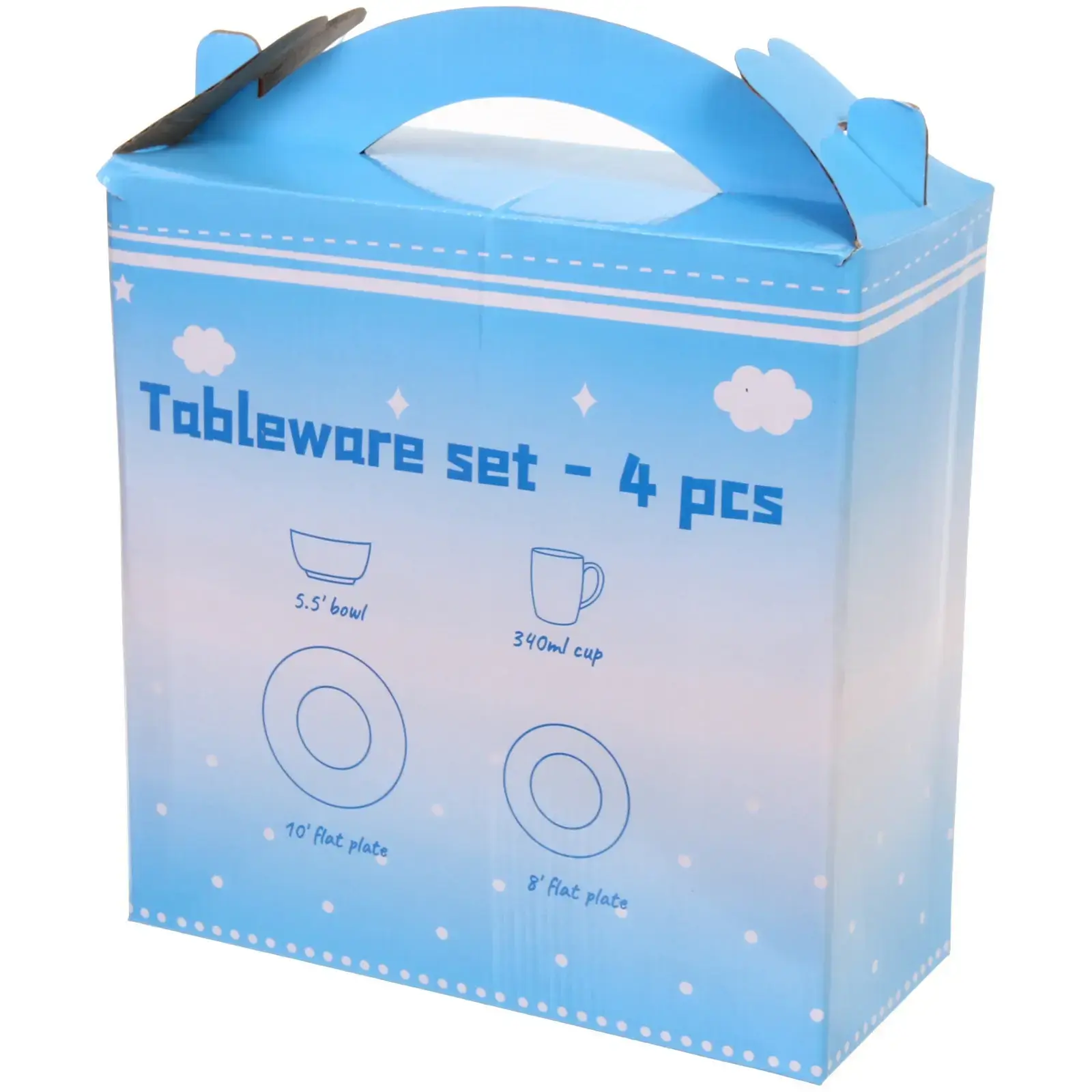 Каждый элемент набора имеет гладкую поверхность и округлую форму, что делает их удобными в использовании. Цветовая гамма включает белый и голубой цвета с яркими акцентами, что добавляет праздничного настроения. Размеры предметов идеально подходят для подачи как горячих, так и холодных блюд, а также для сервировки десертов.