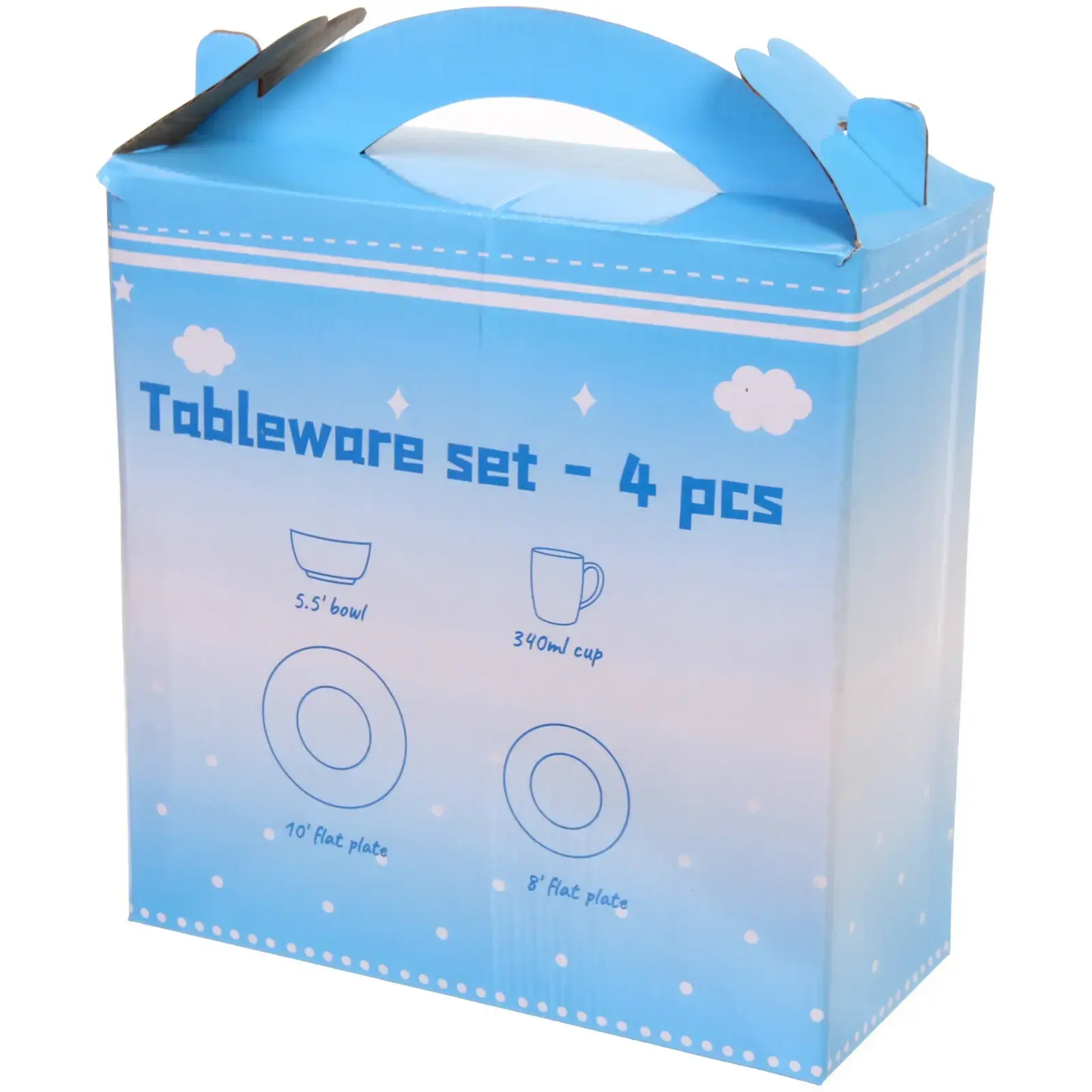 В набор входят четыре предмета: кружка объемом 330 мл, глубокая тарелка диаметром 13 см, плоская тарелка диаметром 20 см и плоская тарелка диаметром 25 см. Все элементы выполнены из качественной керамики, что обеспечивает долговечность и легкость в уходе. Набор подходит для использования как в домашних условиях, так и для праздничных мероприятий.