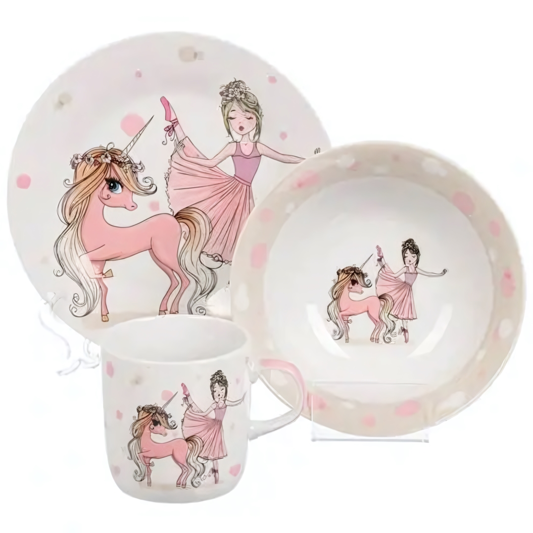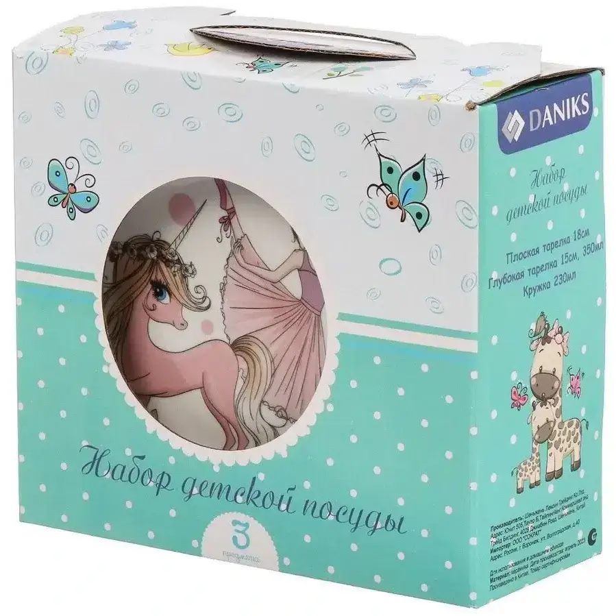- Яркий дизайн: Очаровательные изображения девочки в розовом платье и милого единорога на каждом предмете набора, выполненные в нежных тонах, обязательно понравятся вашему малышу и поднимут настроение.