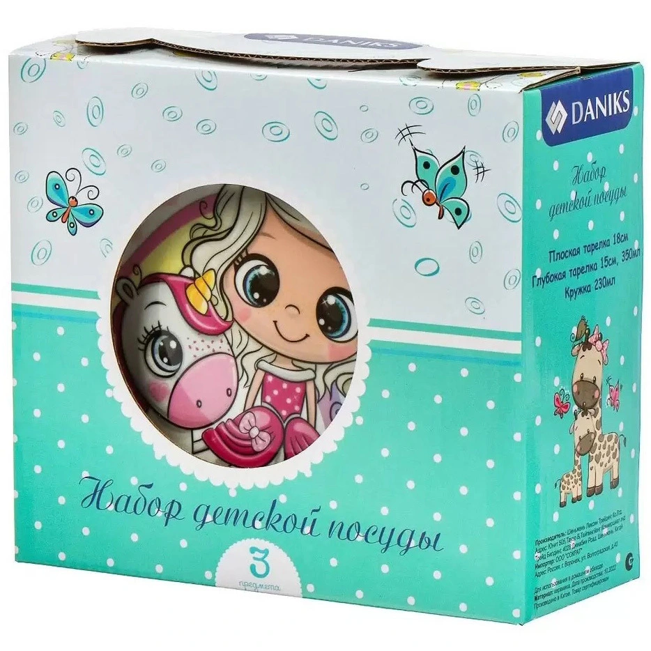 Набор упакован в красочную подарочную коробку с бирюзовым дизайном, что делает его готовым презентом на день рождения, Новый год или другой детский праздник. Это не просто посуда, а целый сказочный мир, который понравится любой маленькой девочке.