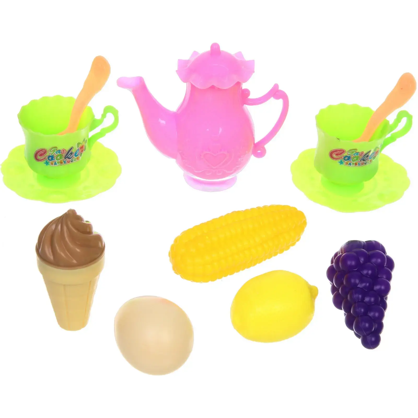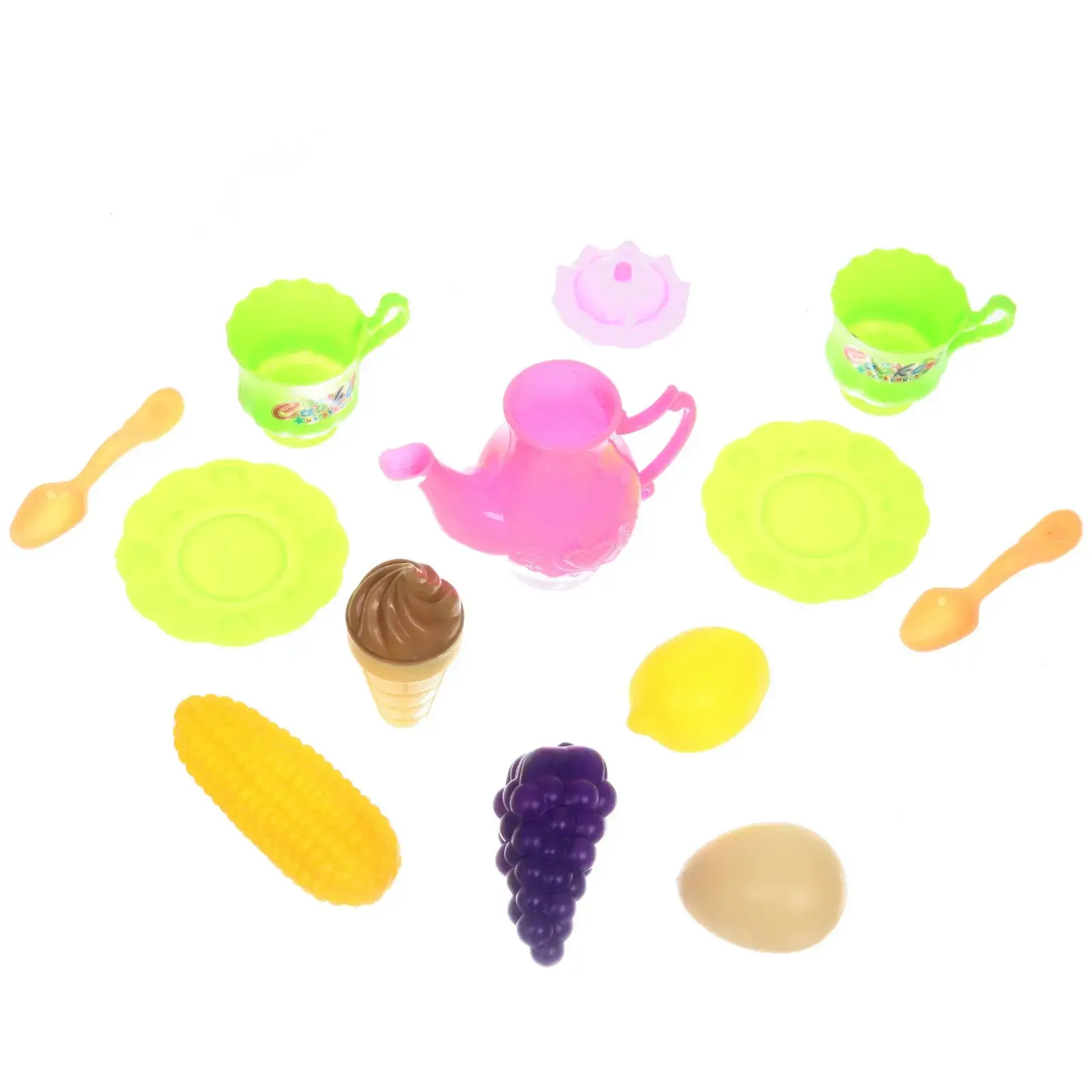 Набор включает в себя чайник, чашки, тарелки и множество игрушечных продуктов, таких как мороженое, кукуруза и лимон. Все элементы идеально подходят для ролевых игр, позволяя детям имитировать приготовление пищи и сервировку стола. Игрушки подходят для детей от 3 лет и помогут развить их социальные навыки и воображение.