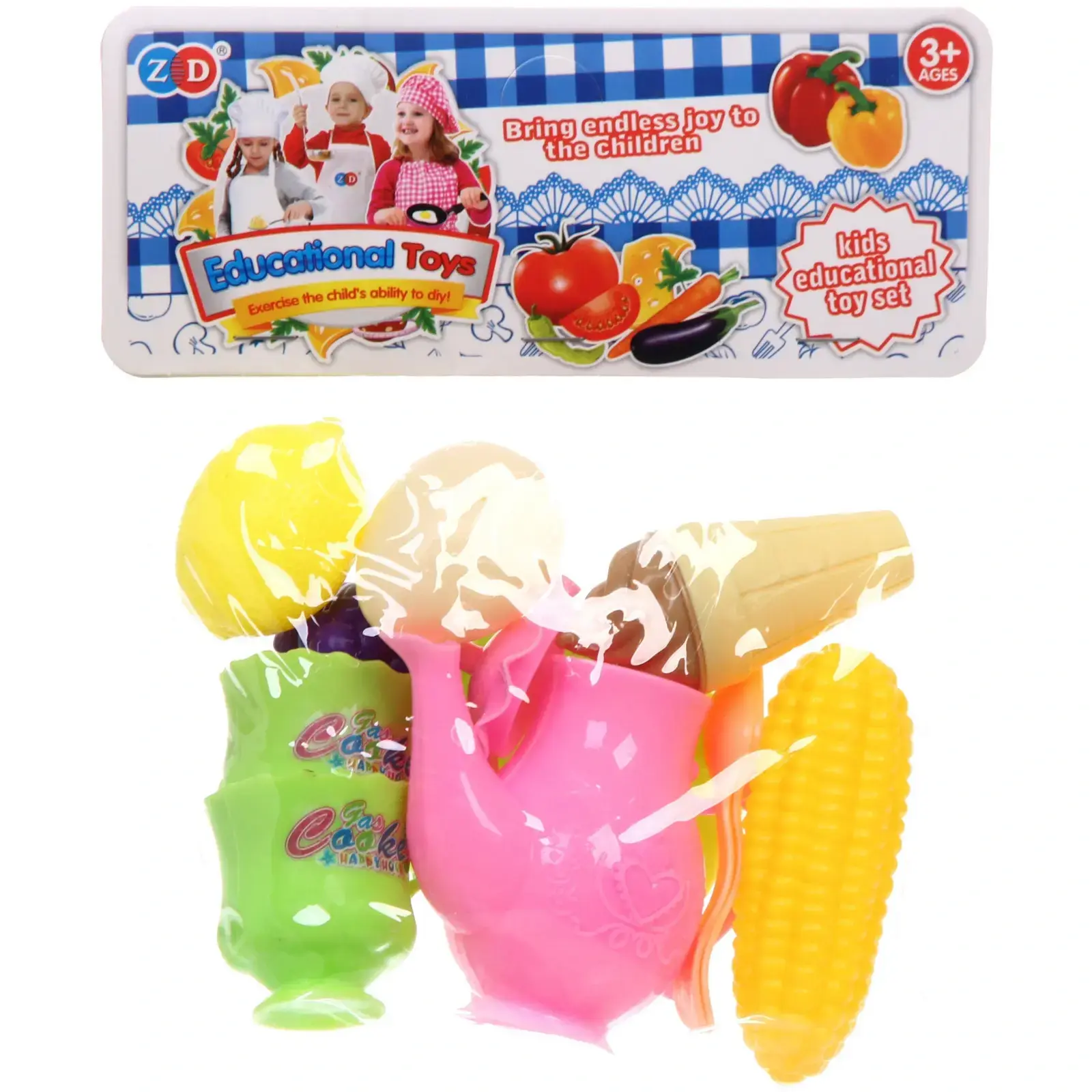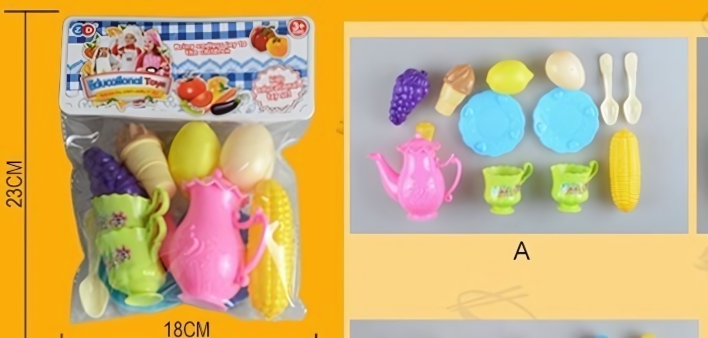 Размер упаковки составляет 23 см на 18 см, что делает набор компактным и удобным для хранения. Все игрушки выполнены из качественного пластика, безопасного для детей. Набор упакован в прозрачный пакет, что позволяет видеть все элементы и делает его отличным подарком для маленьких поваров.