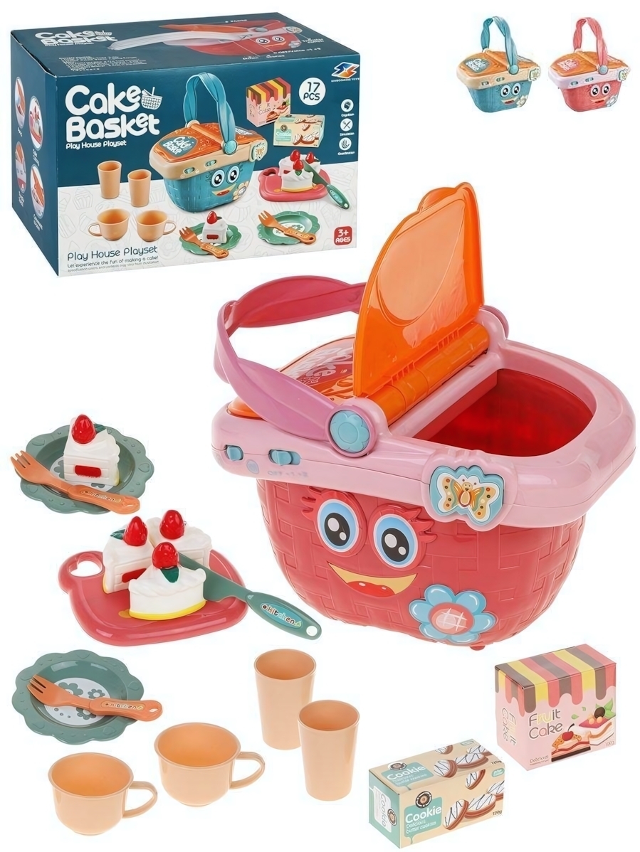 Игровой набор посуды для девочек, 17 предметов в корзине с ручкой, розово-голубой, от 3 лет